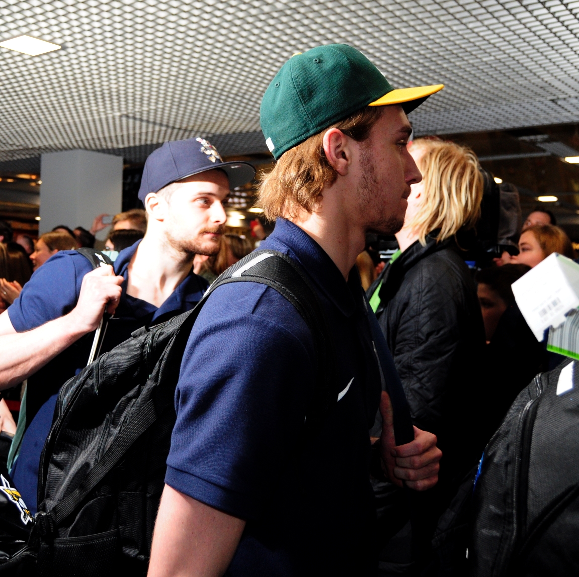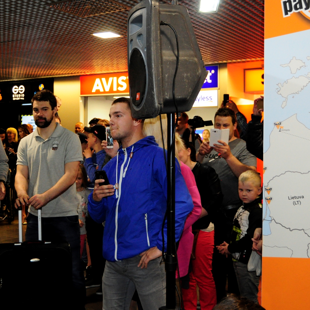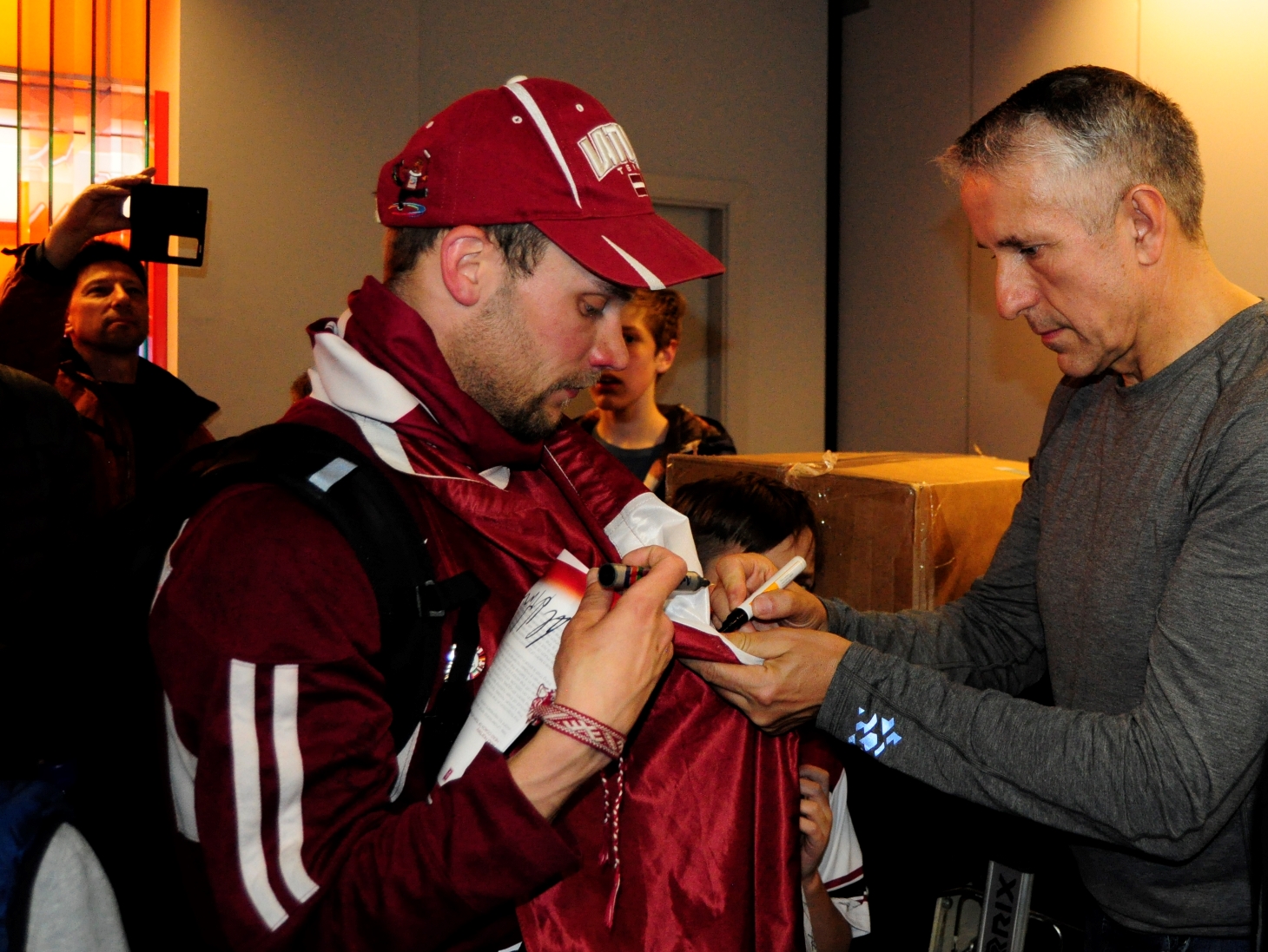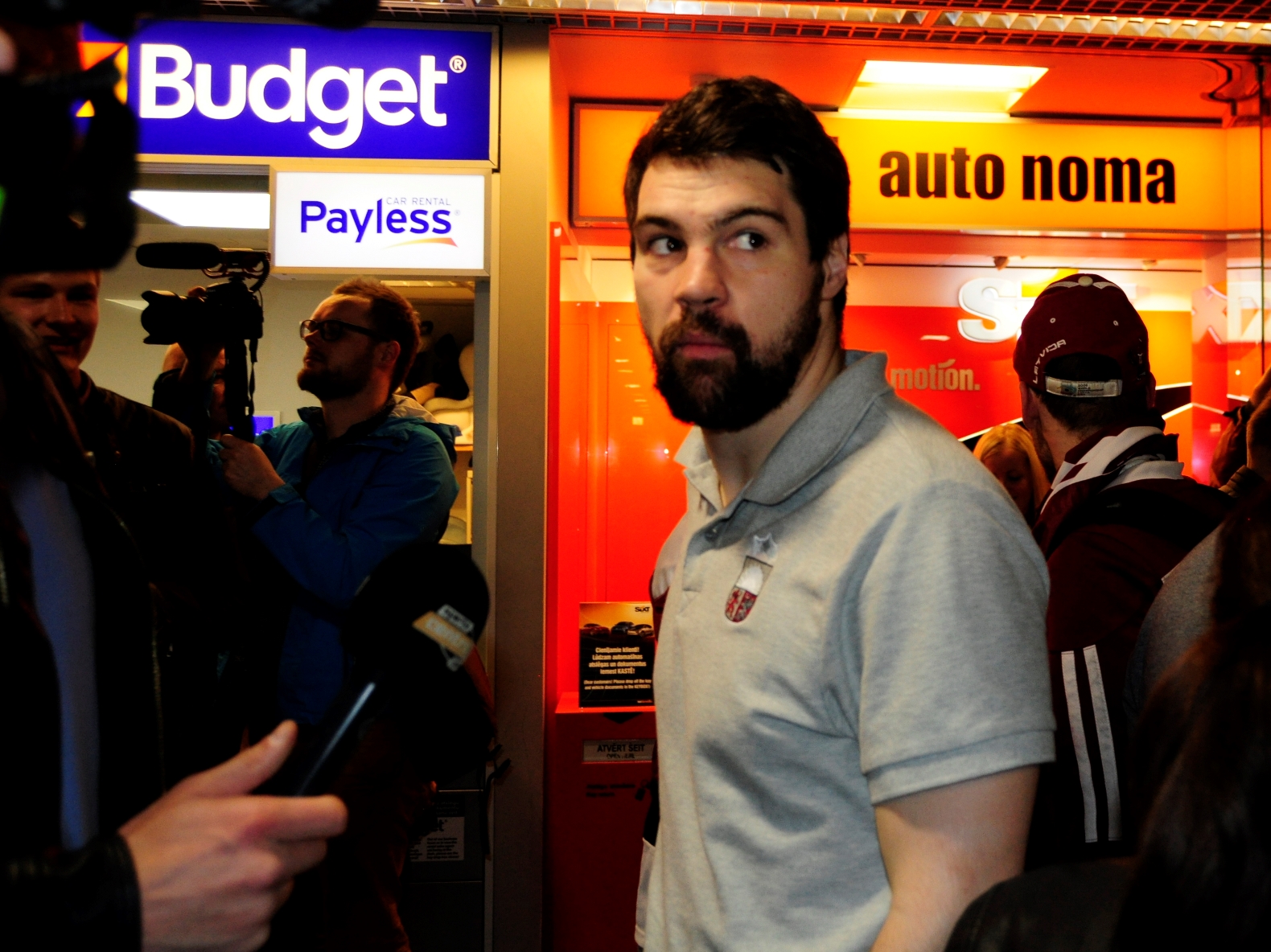 Neskatoties uz sāpīgo neveiksmi, mūsu hokejistus lidostā sagaidīja pāris simti līdzjutēju, no kuriem liela daļa bija tērpusies izlases formas kreklos. Pirms hokejistu parādīšanās pie mikrofona iekārtojās aktieris Gints Andžāns, kurš pārējo fanu atbalstīts sāka dziedāt “Jā, mēs esam un būsim labākie”. Šo muzikālo priekšnesumu dzirdēja tikai komandas kapteinis Kaspars Daugaviņš, kurš no ielidošanas termināla iznāca pirmais. Siltā sagaidīšana sportistiem lika atplaukt smaidā un uzkavēties lidostā, lai iemūžinātos ar faniem un aprunātos ar presi. Zemgusa Girgensona seju rotāja svaigas rētas, bet pat tas nebija šķērslis iepozēt ar faniem. “Tuvākās dienas nedarīšu neko. Vienkārši atpūtīšos un tad jau jāsāk gatavoties lidot atpakaļ uz Ameriku,” savus tuvākos plānus sarunā ar ritakafiju.lv atklāj Girgensons. Šī čempionāta publikas mīlulis nenoliedzami ir vārtsargs Elvis Merzļikins. “Šī komanda bija saliedēta, mēs bijām kā ģimene. Tas ir svarīgākais – justies kā vienotai komandai un kopā ir krietni vieglāk paveikt sev uzticētos uzdevumus. Viens otram uzticējāmies, kopā priecājāmies un skumām. Īstenībā, tas ir liels trenera nopelns. Man ļoti patika strādāt ar Hārliju. Noteikti spēlētu jebkur, kur viņš mani aicinātu,” par pasaules čempionātu savās pārdomās dalās Merzļikins. Atgriežoties mājās sporta soma uz pāris nedēļām tiks nolikta malā un puisis baudīs atpūtu neko nedarot. “Īstenībā gribās vienkārši ar plikām kājām iekāpt smiltīs un baudīt vasaru. Sporta soma būs pagrabā vismaz pusotru mēnesi,” smaidot savus plānus atklāj Merzļikins.