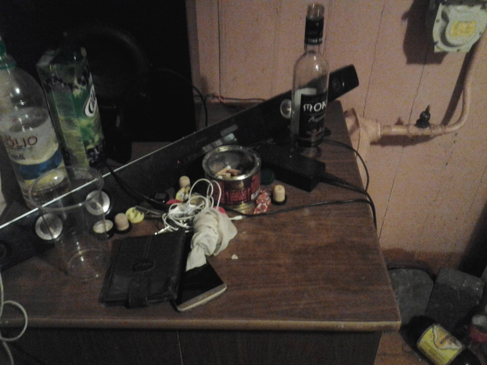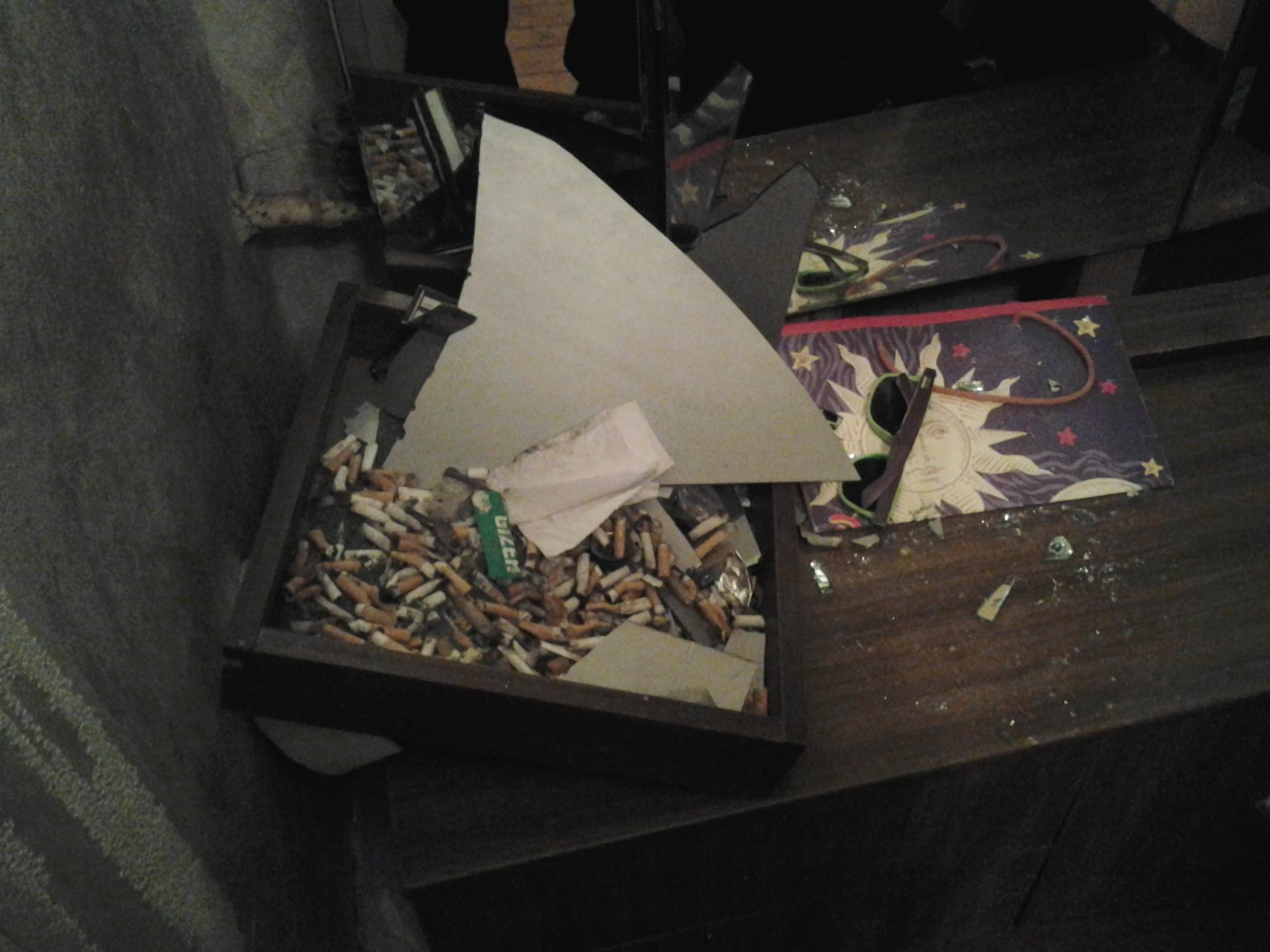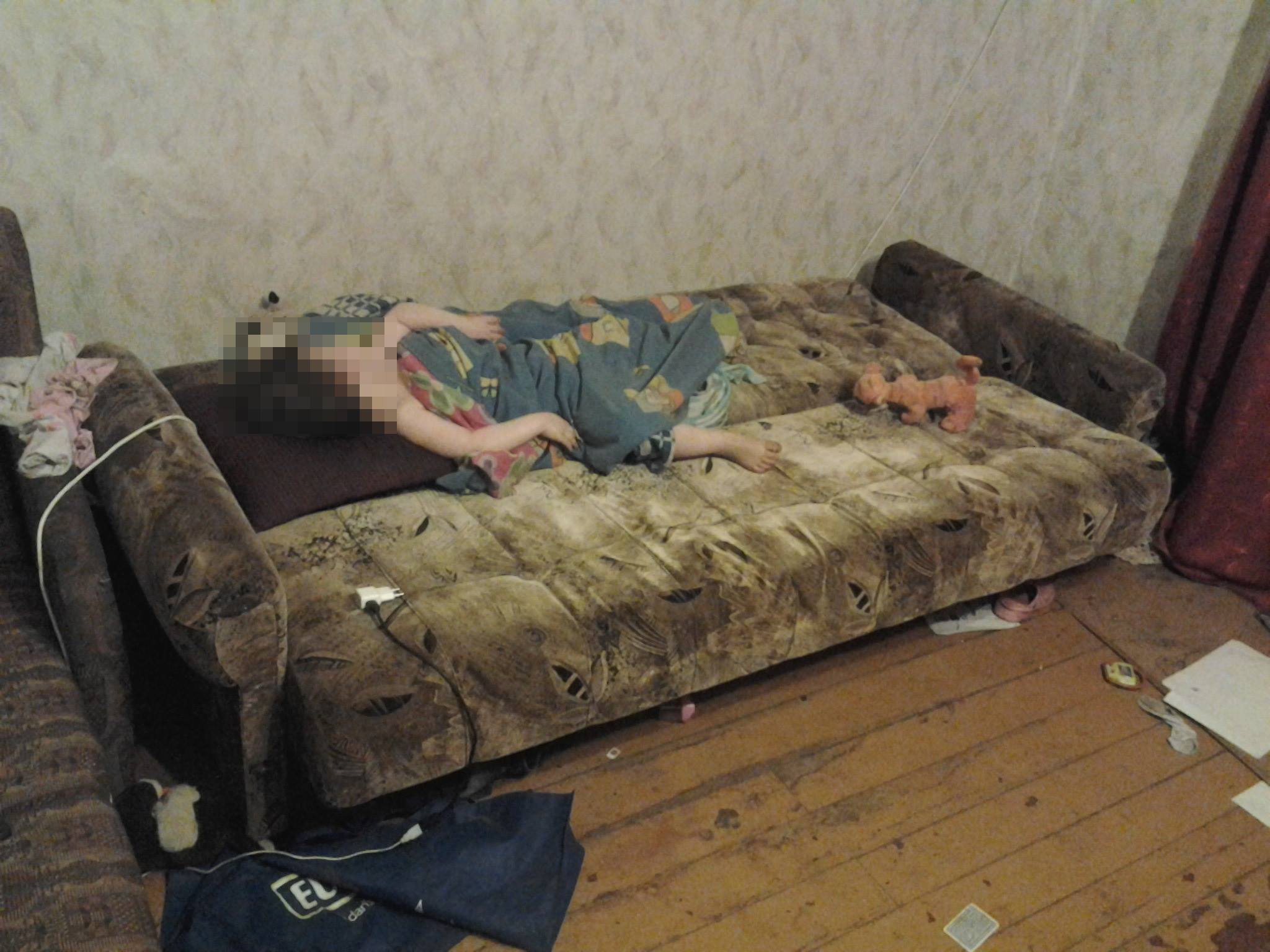 Apskatot dzīvokli, konstatēts, ka telpas ir piesmēķētas un nekārtīgas. Uz grīdas metējās tukšas divlitrīgās alus pudeles, izsmēķi, ēdiena paliekas un netīras drēbes. Priekštelpā bija sadauzīts spogulis un apkārt mētājās tā lauskas. Savukārt lielākajā no istabām uz dīvāna gulēja aptuveni četrus gadus veca meitenīte ar kādu iereibušu sievieti. Telpās valdīja spēcīgs alkohola un cigarešu dūmu smārds. Pārrunu laikā pamodās arī sieviete, kura paskaidroja, ka pieskatot draudzenes meitu līdz tā atnāks no ballītes.