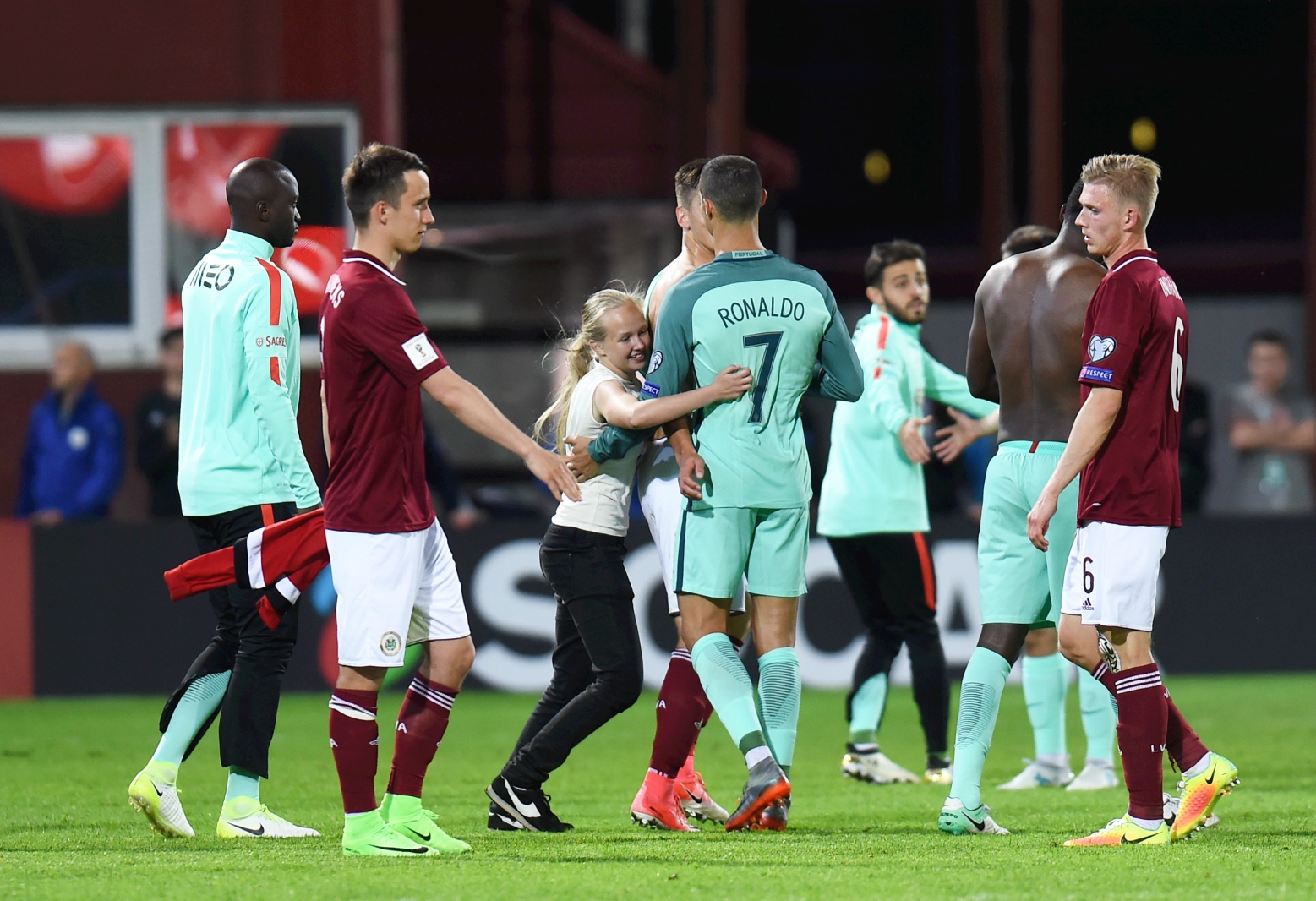- Futbola spēles laikā starp Latviju un Portugāli uz laukuma uzskrien zēns, lai apskautu Ronaldu