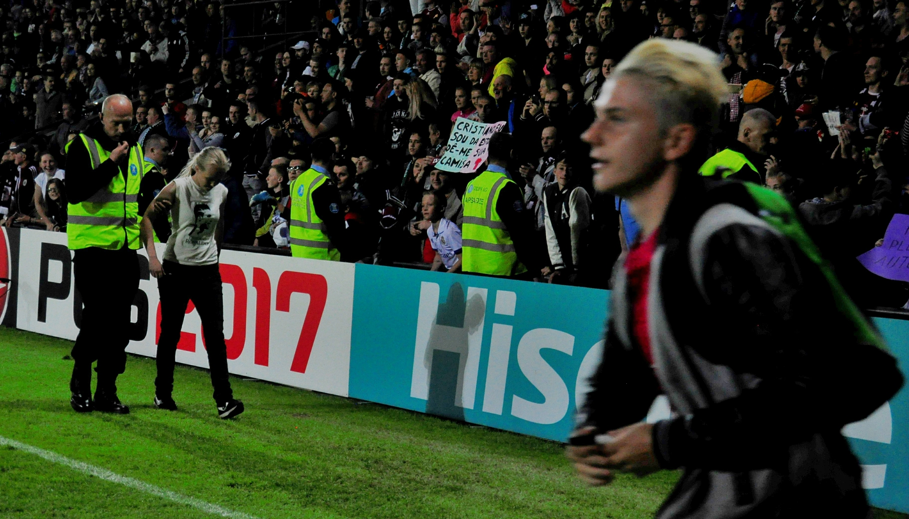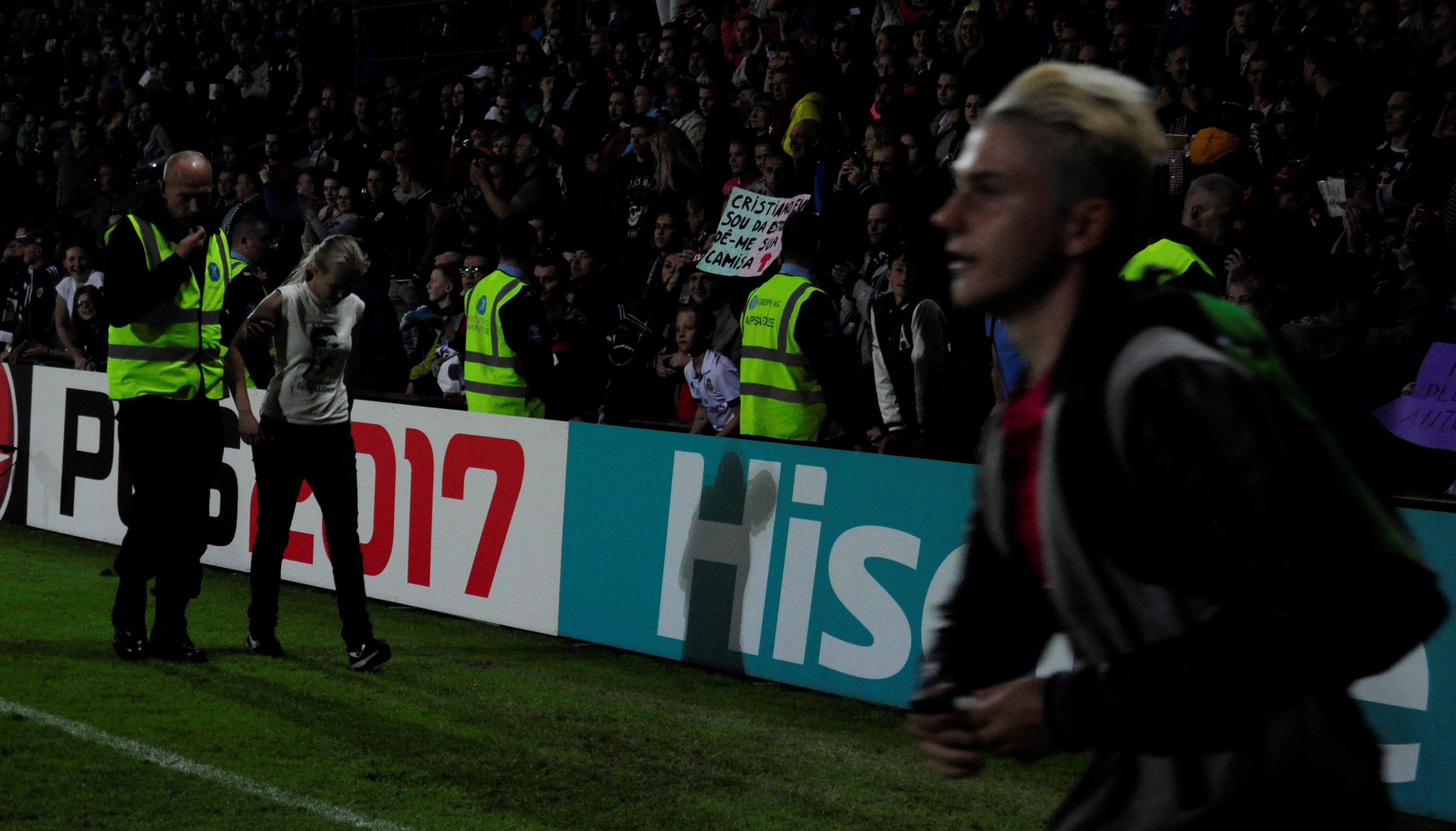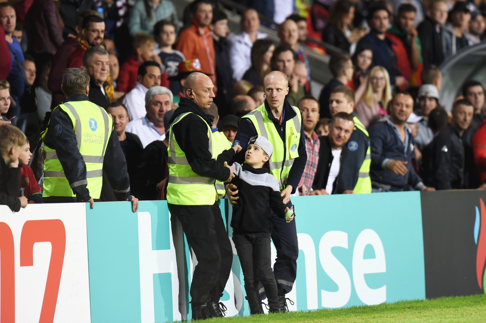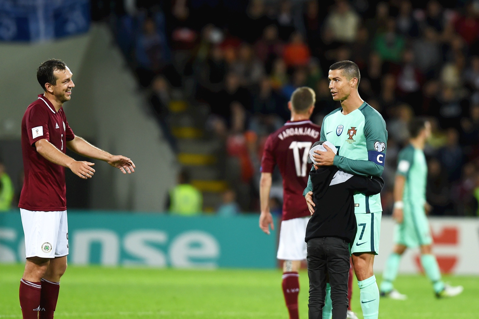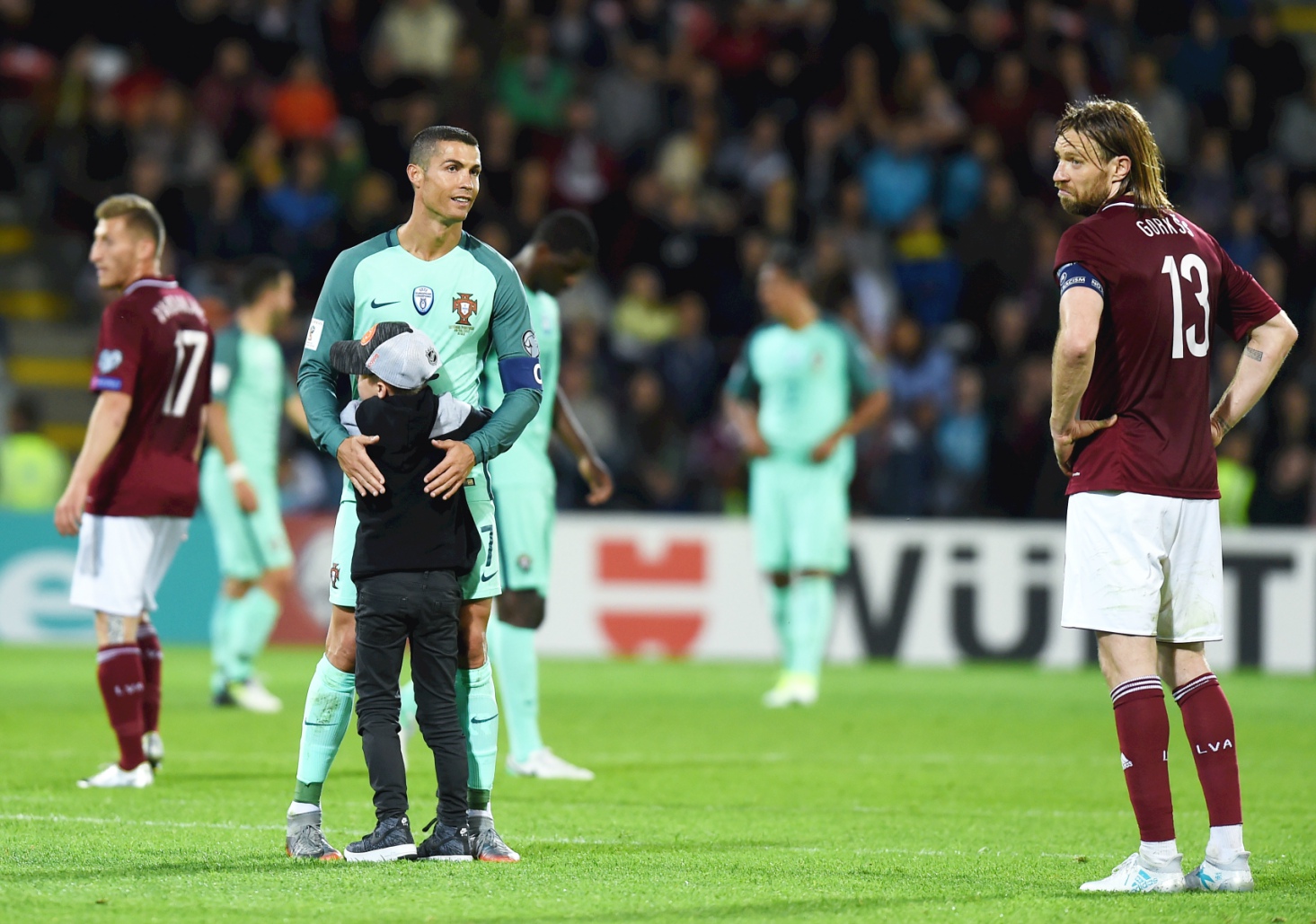 - Futbola spēles laikā starp Latviju un Portugāli uz laukuma uzskrien zēns, lai apskautu Ronaldu