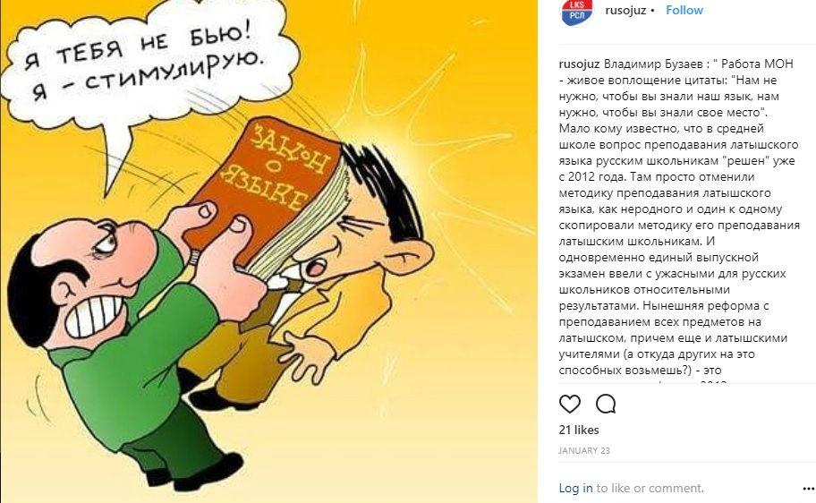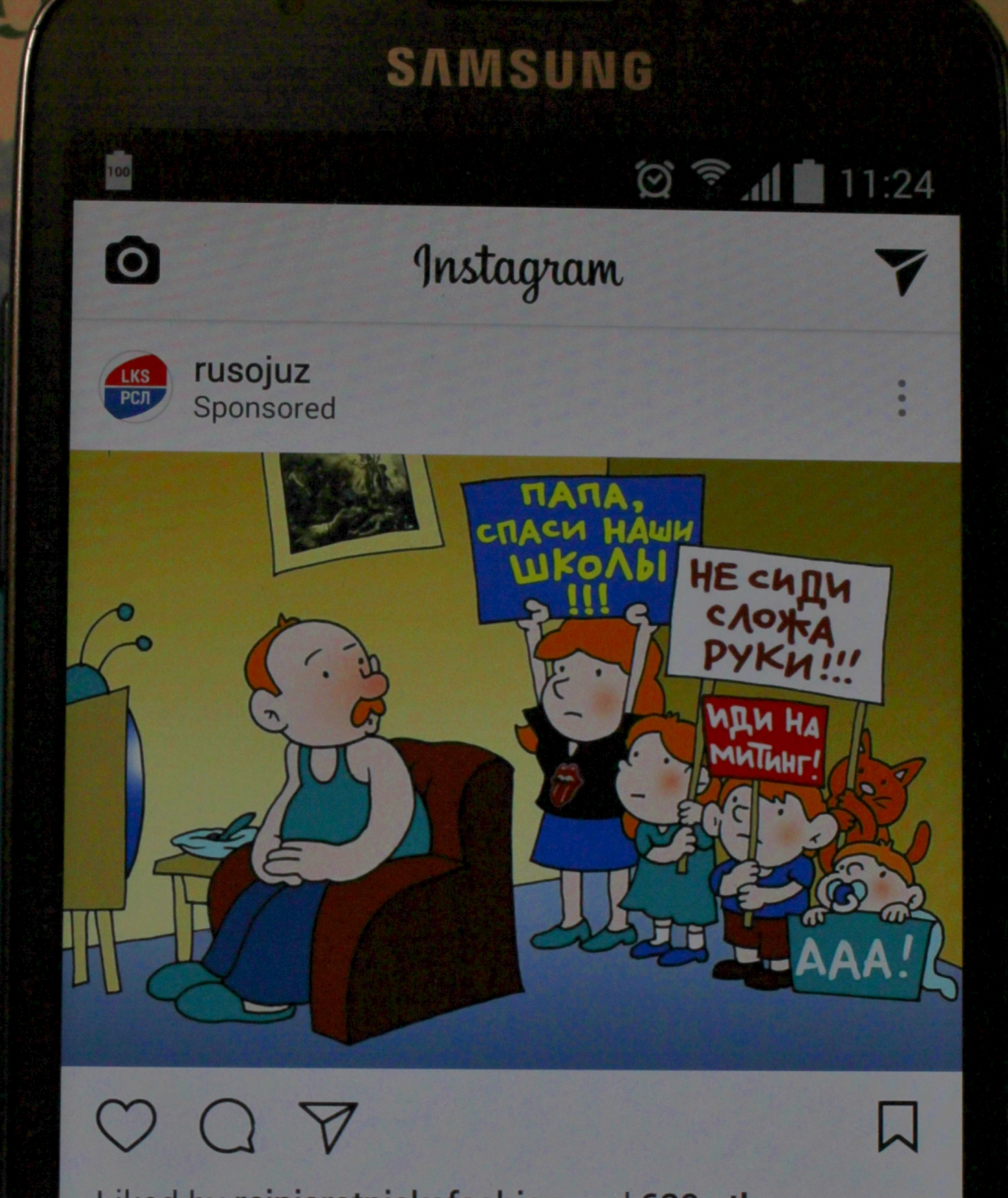 Jau ceturtdien kārtējā Saeimas plenārsēdē gaidāms balsojums par skolu reformām. Pašmāju Krievijas politisko uzskatu propagandas smagsvari ar Tatjanu Ždanoku priekšgalā jau no paša rīta solās pie Saeimas nama nākt ar kārtējo krievu skolu glābšanas protestu. Līdz šim sociālajos tīklos komentētāji varēja irgoties, ka plakātu ar tekstu : “Vēlos mācīties dzimtajā valodā”, turēja kundzītes pensijas vecumā. Šoreiz Ždanokas Krievu savienība visiem spēkiem gatavojās piketā piesaistīt arī jauniešus un viņu vecākus. Savu mērķu sasniegšanai šis politiskais veidojums ir izveidojis savu profilu sociālajā tīklā instagram.com, kurā ievietojis vairākas karikatūras, kas kā sponsorēts saturs pēdējās trīs dienas ir pārņēmis instagram.com. No šīs propagandas invāzijas vienīgā iespēja izvairīties ir doties uz viņu kanālu un uzlikt opciju bloķēt.
