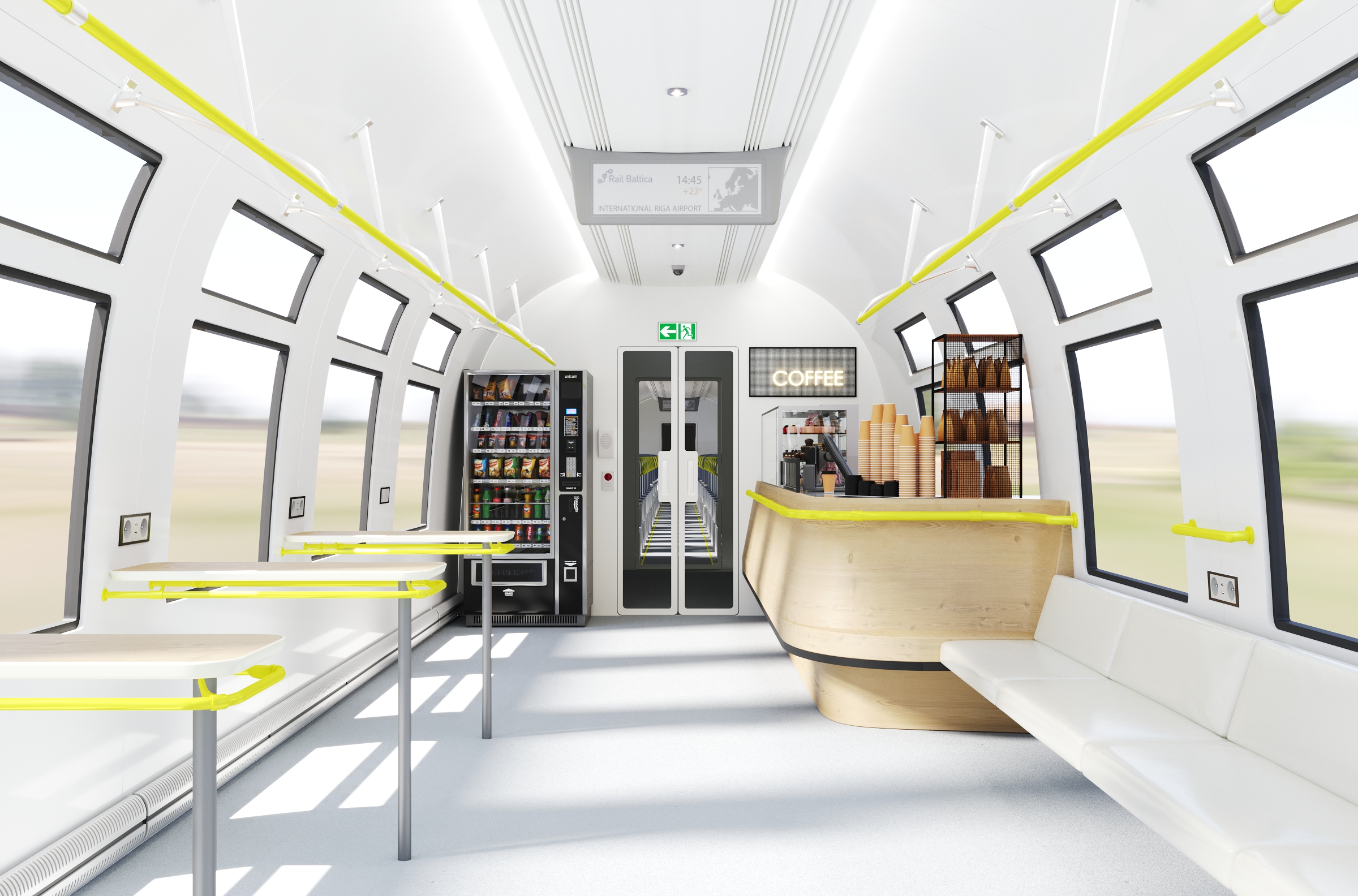Kafejnīca, kas atradīsies starp standarta un pirmo klasi, būs pieejama visiem pasažieriem, lai ceļojuma laikā iegādātos dzērienus un uzkodas.