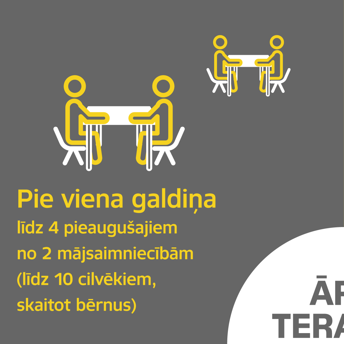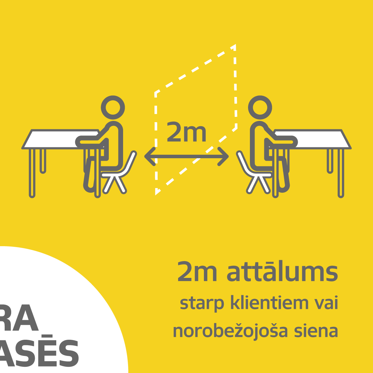 Vienlaikus jānodrošina vismaz divu metru attālums starp pie dažādiem galdiņiem sēdošajām personām, ja starp galdiņiem nav izveidota norobežojoša siena.
