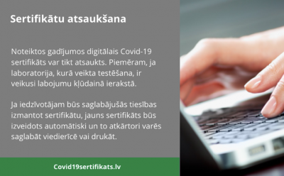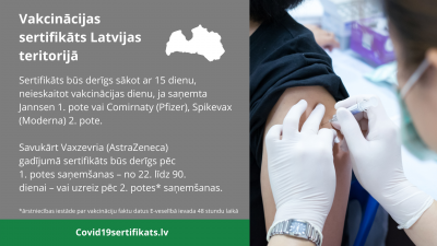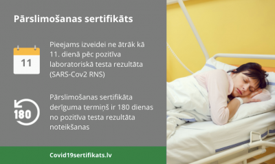 No 2021. gada 21. jūlija vakcinācijas sertifikātu Covid-19 pārslimojušie iedzīvotāji var iegūt, saņemot vienu jebkura ražotāja Covid-19 vakcīnas devu – ja vakcinācija veikta 180 dienu laikā pēc laboratoriski apstiprināta pozitīva Covid-19 testa un, ja no vakcinācijas veikšanas ir pagājušas 14 dienas, neskaitot vakcinācijas dienu, informē Nacionālais veselības dienests (NVD)