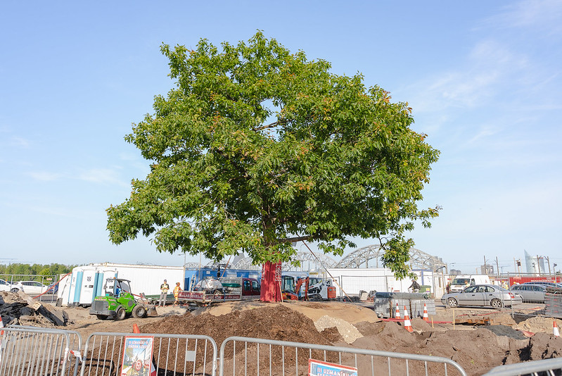 Naktī no 13. uz 14. jūniju no pagaidu novietnes pie iebrauktuves Rīgas starptautiskajā autoostā uz pastāvīgo atrašanās vietu Ģenerāļa Radziņa krastmalā tika pārvietots un iestādīts autoostas sarkanais ozols.