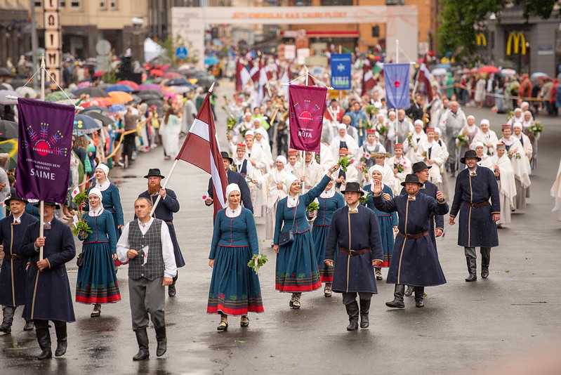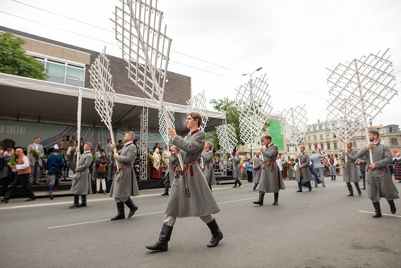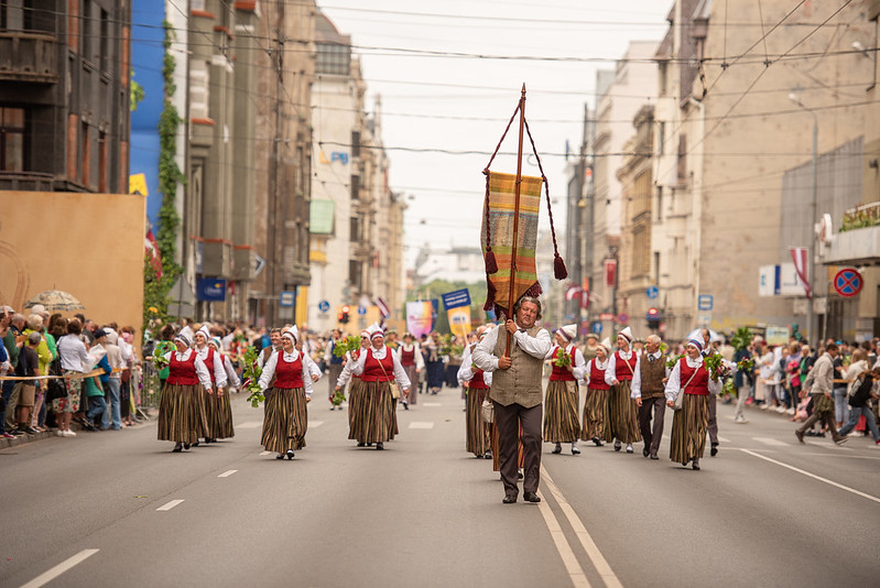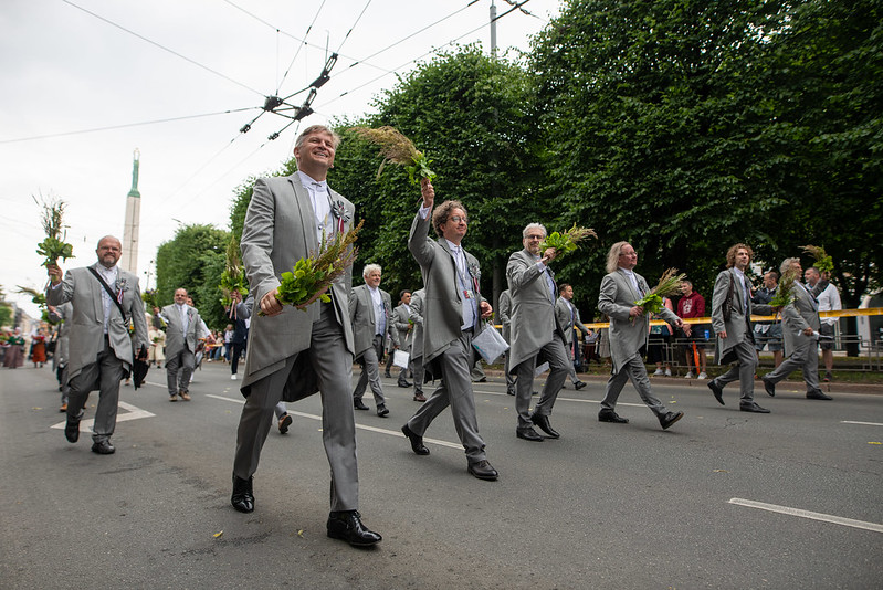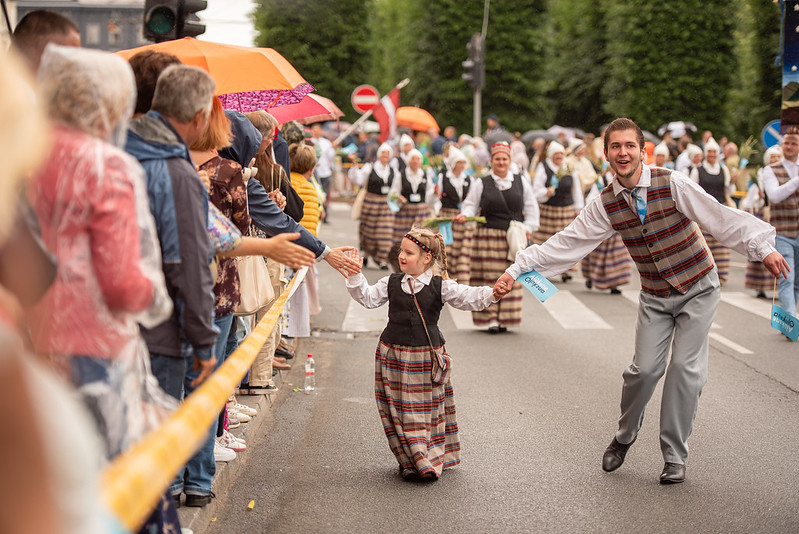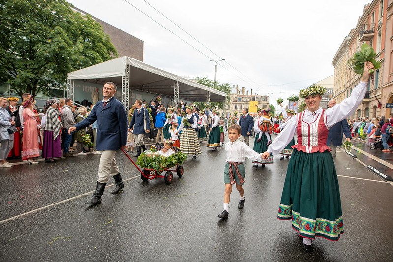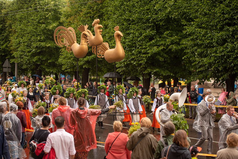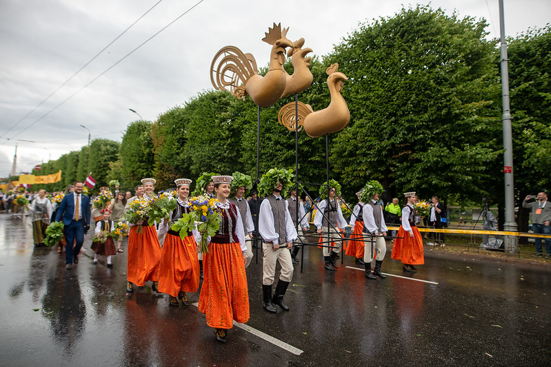 Dziesmusvētku dalībnieku gājiens ir neatņemama svētku tradīcijas sastāvdaļa. Kā krāšņa upe tas vijas par galveno Rīgas ielu, aizsākoties pie Brīvības pieminekļa un noslēdzoties pie Dailes teātra. Tautas tērpu krāšņums, gaviles, satikšanās prieks un Dziesmusvētku svinēšana. Gājiena laikā katrs novads parāda savu unikalitāti un dižojas ar savām tradīcijām un kultūras mantojumu, informē Rīgas pašvaldība. Tradicionāli Rīga gājienā kā “namamāte” dodas pēdējā, šogad pārstāvot 11 753 dalībnieku lielu pulku un simboliski gājienu ievadot ar trīs Rīgas baznīcu gaiļiem.