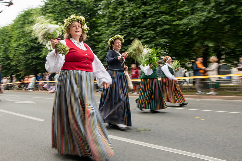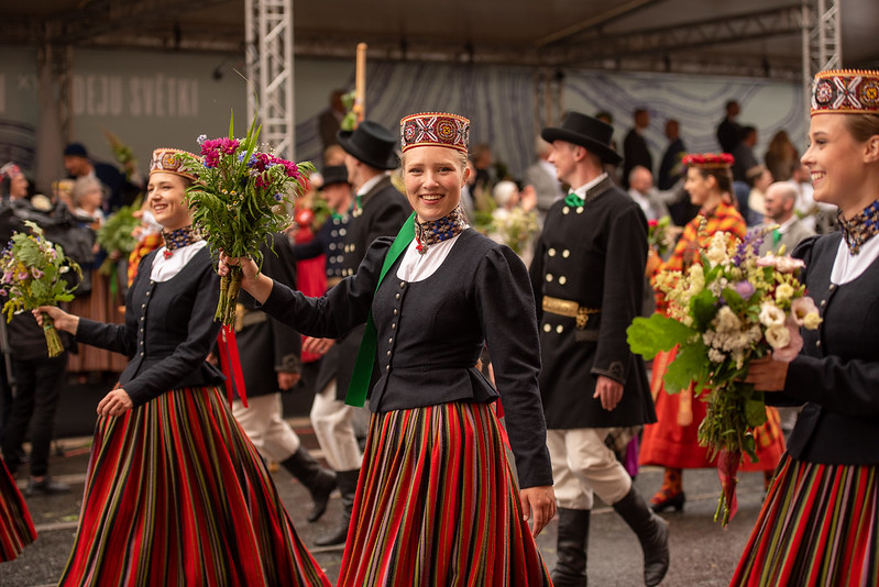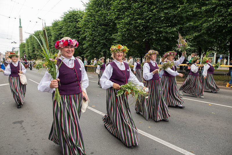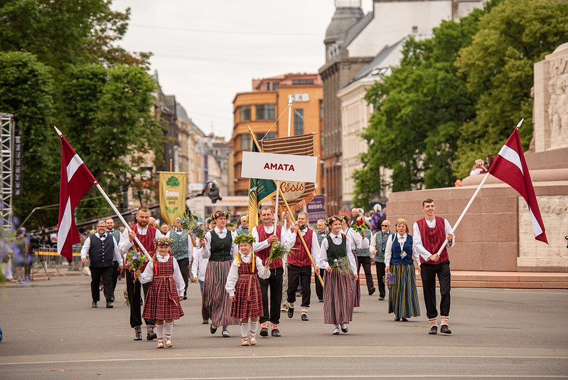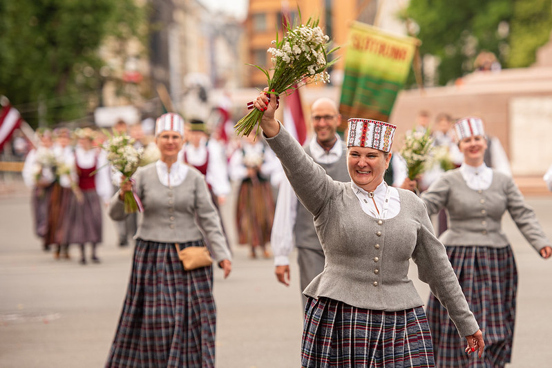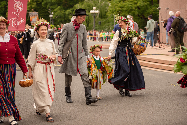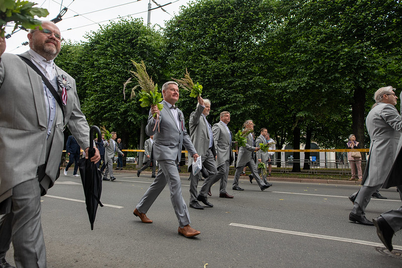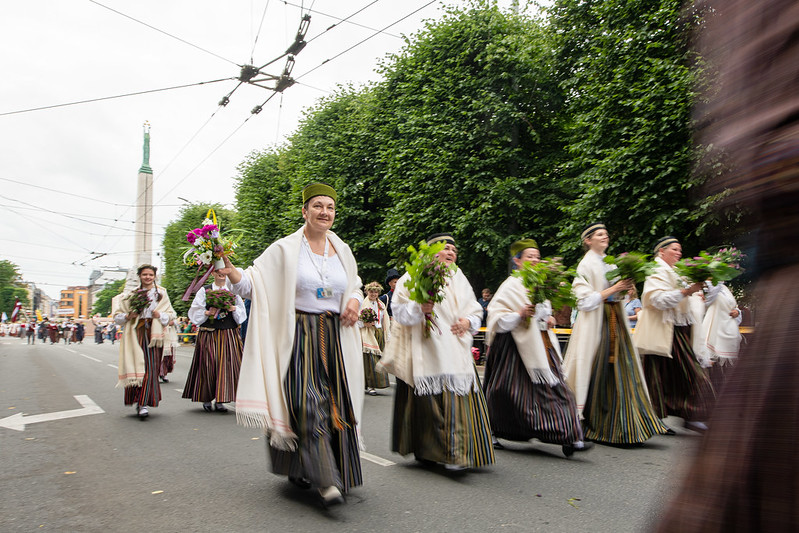 Dziesmusvētku dalībnieku gājiens ir neatņemama svētku tradīcijas sastāvdaļa. Kā krāšņa upe tas vijas par galveno Rīgas ielu, aizsākoties pie Brīvības pieminekļa un noslēdzoties pie Dailes teātra. Tautas tērpu krāšņums, gaviles, satikšanās prieks un Dziesmusvētku svinēšana. Gājiena laikā katrs novads parāda savu unikalitāti un dižojas ar savām tradīcijām un kultūras mantojumu, informē Rīgas pašvaldība. Tradicionāli Rīga gājienā kā “namamāte” dodas pēdējā, šogad pārstāvot 11 753 dalībnieku lielu pulku un simboliski gājienu ievadot ar trīs Rīgas baznīcu gaiļiem.
