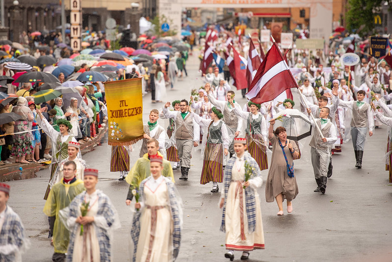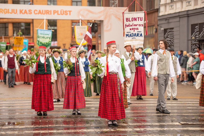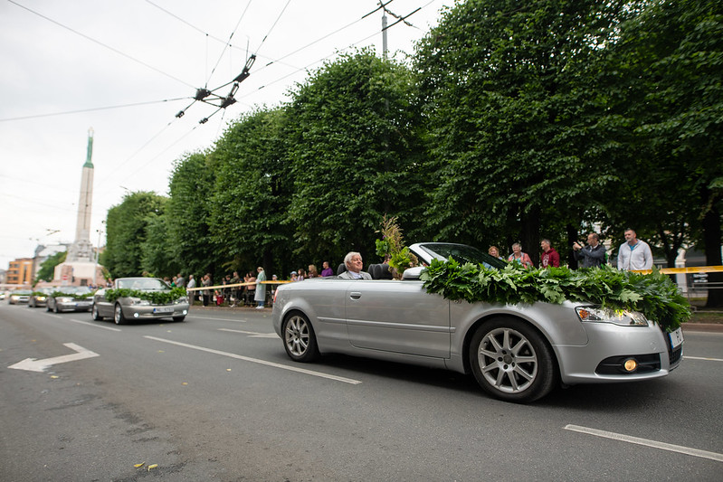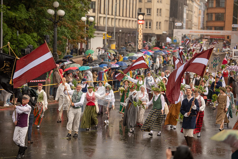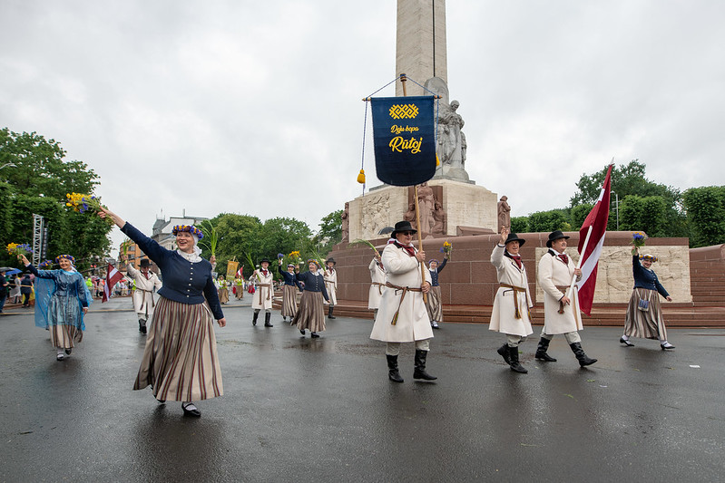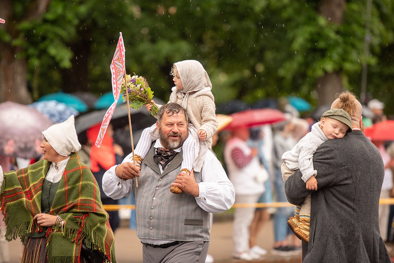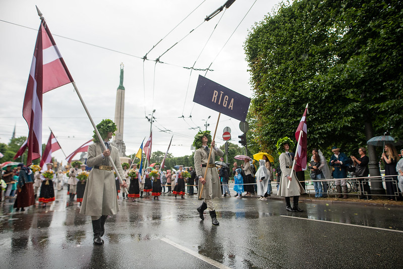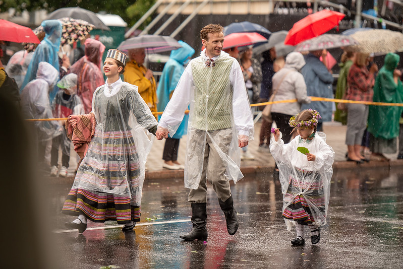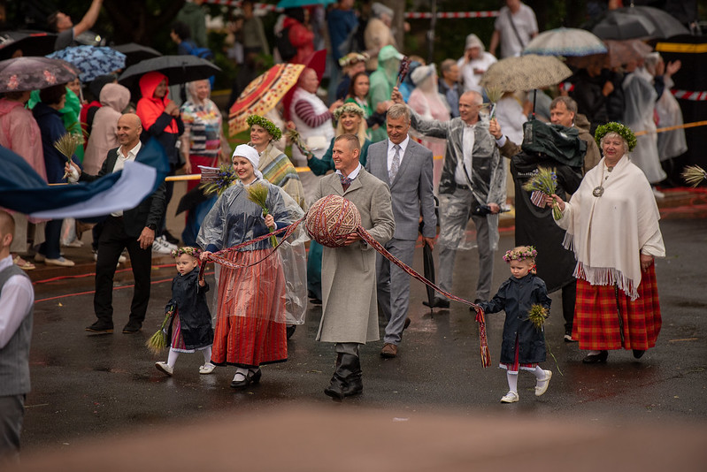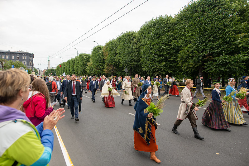 Spītējot lietum, tūkstošiem Dziesmu un deju svētku dalībnieku, valsts augstākās amatpersonas un pašvaldību vadītāji svētdien, 2. jūlijā, piedalījās svētku gājienā “Novadu dižošanās”.