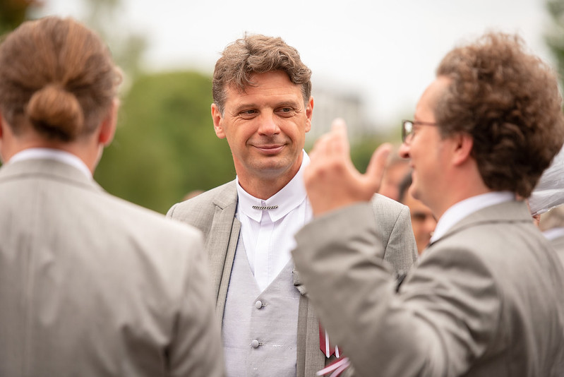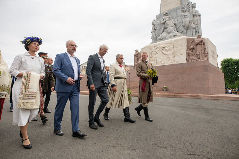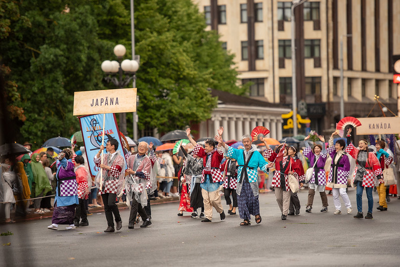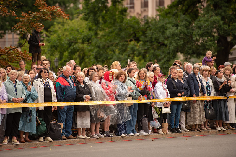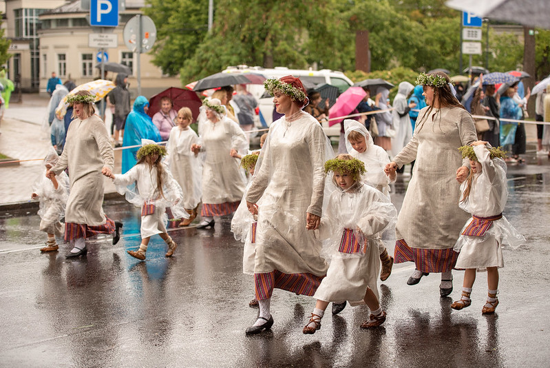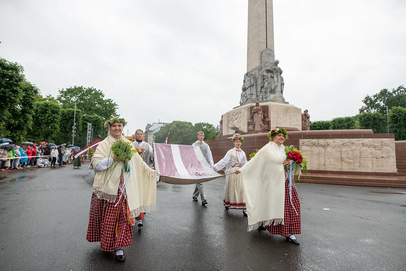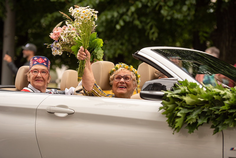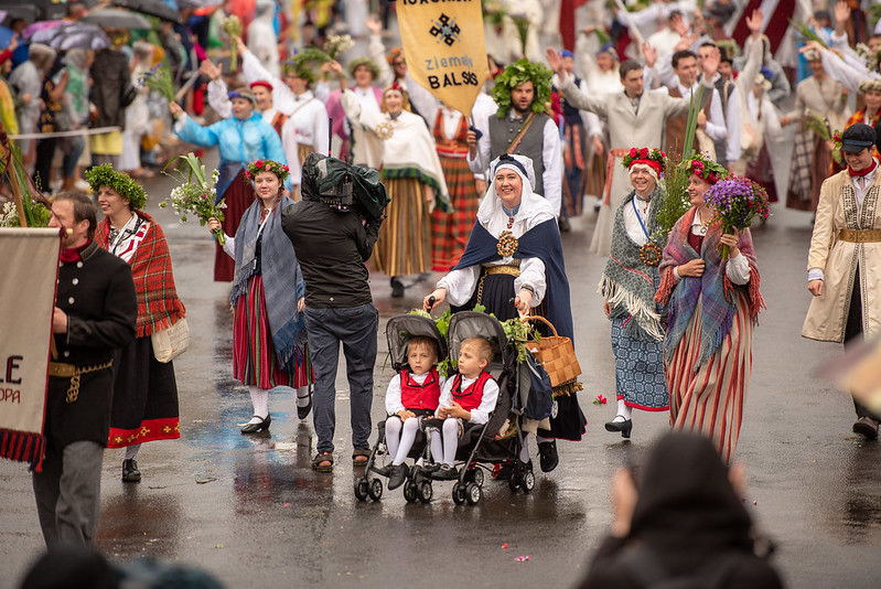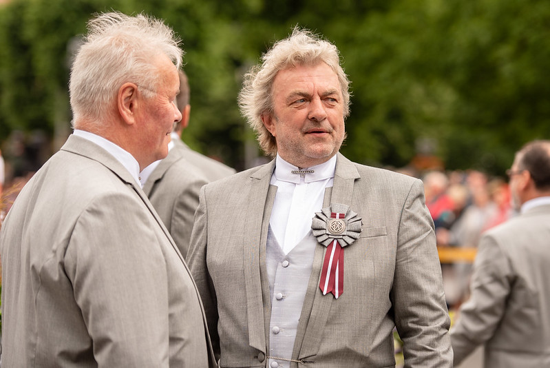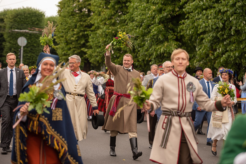 Spītējot lietum, tūkstošiem Dziesmu un deju svētku dalībnieku, valsts augstākās amatpersonas un pašvaldību vadītāji svētdien, 2. jūlijā, piedalījās svētku gājienā “Novadu dižošanās”.
