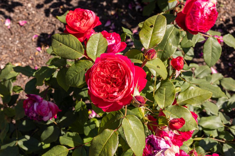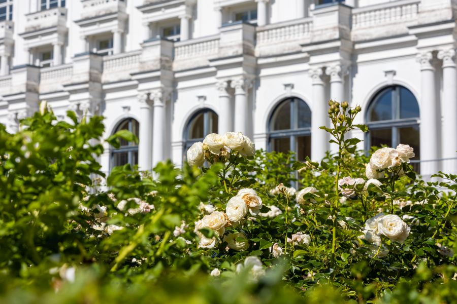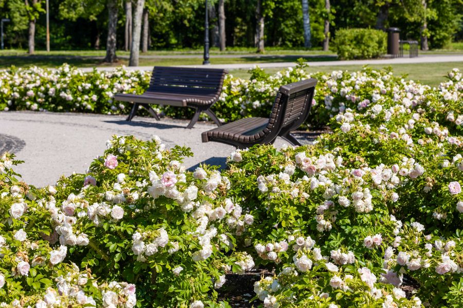 Rožu aleja iekrāsojusies sārtos un oranžos toņos, kur zied rožu šķirnes ‘Credit Mutuel’, ‘Rugelda’, ‘Caramella’, ‘Westerland’, ‘Reine Sammut’. Balto toņu harmoniju veido rožu šķirnes ‘Alabaster’, ‘White Meidiland’, ‘Alise’, ‘Artemis’, ‘Schneewittchen’.