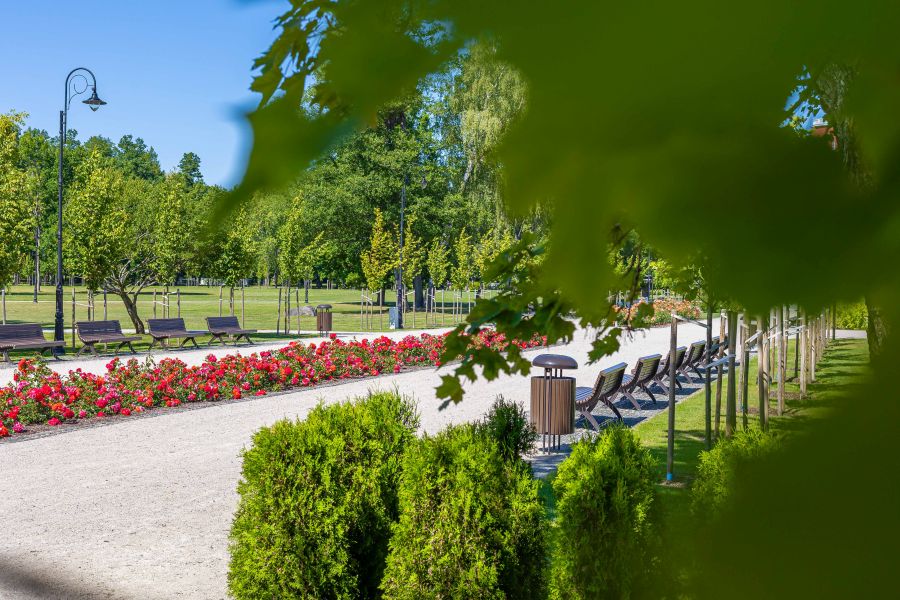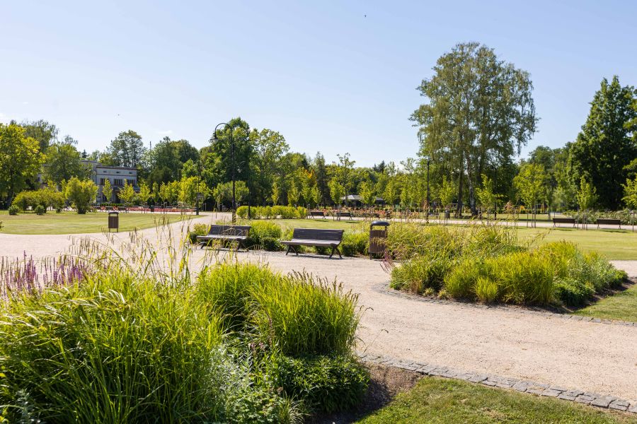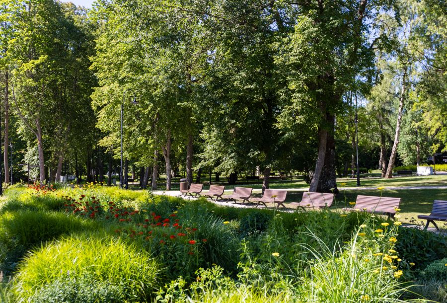 Parka apstādījumos atbilstoši kūrorta stilistikai izmantots daudzveidīgs krāšņumaugu sortiments. Līdzās krāšņi ziedošajām rožu dobēm parku papildina ziemciešu dobju augu sortiments ar izteiktu dekorativitāti un krāšņi ziedošiem augiem 2 000 m2 platībā parka teritorijā un partera zonā līdz 1 700 m2 platībā. Parkā iestādīts vairāk nekā 50 tūkstoši dažādu ziemciešu, garšaugi, 155 Holandes liepas un citi koki un augi.