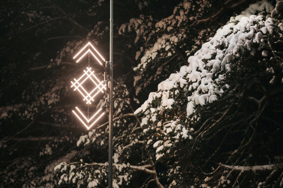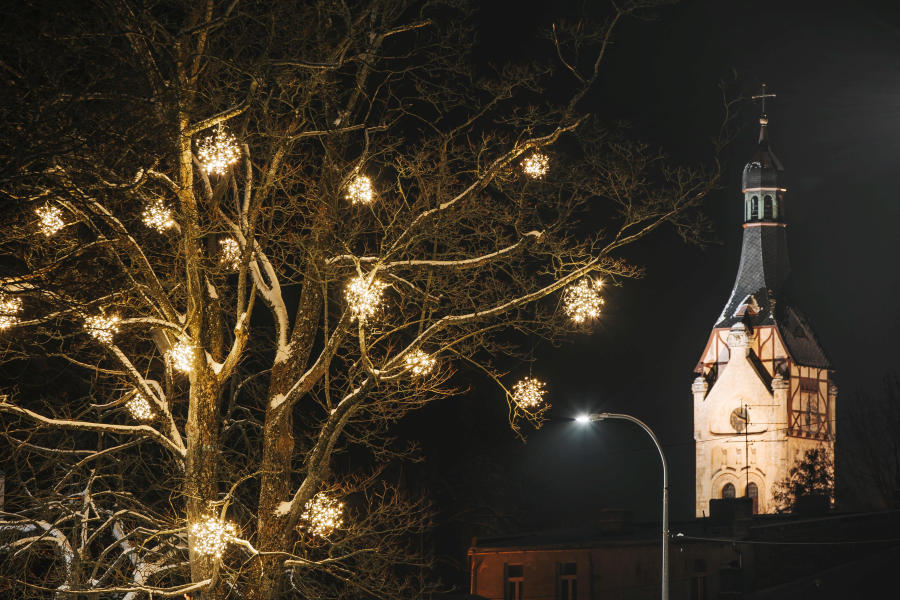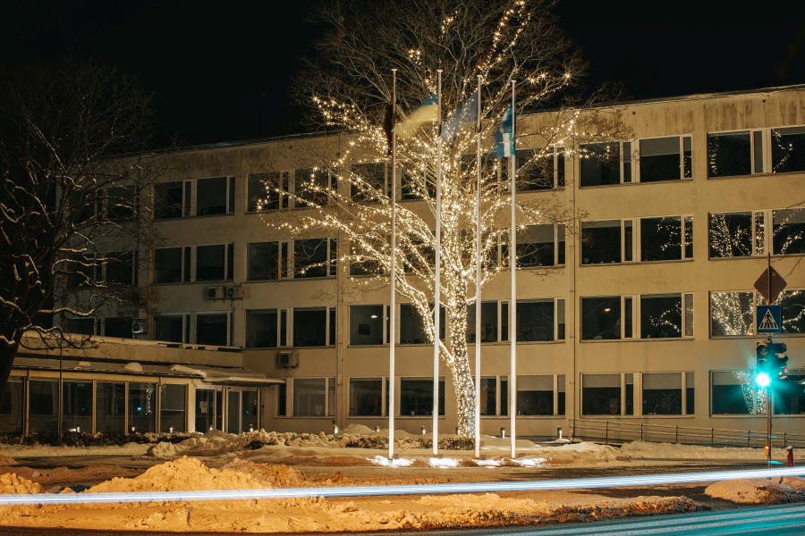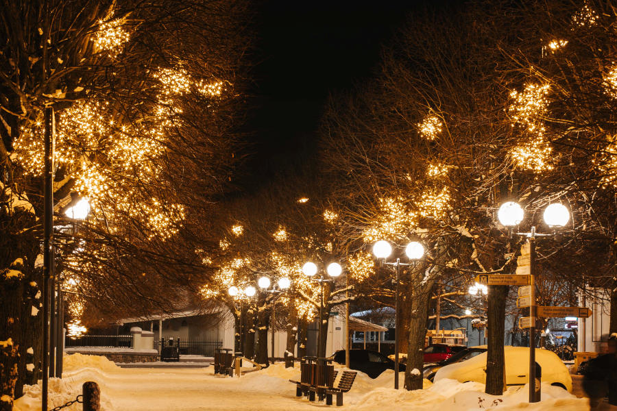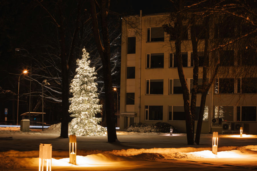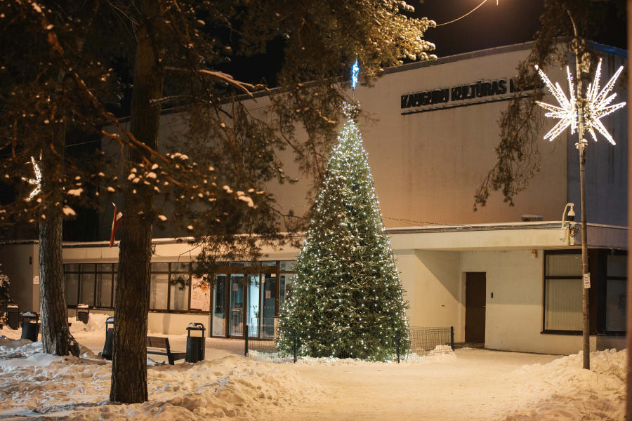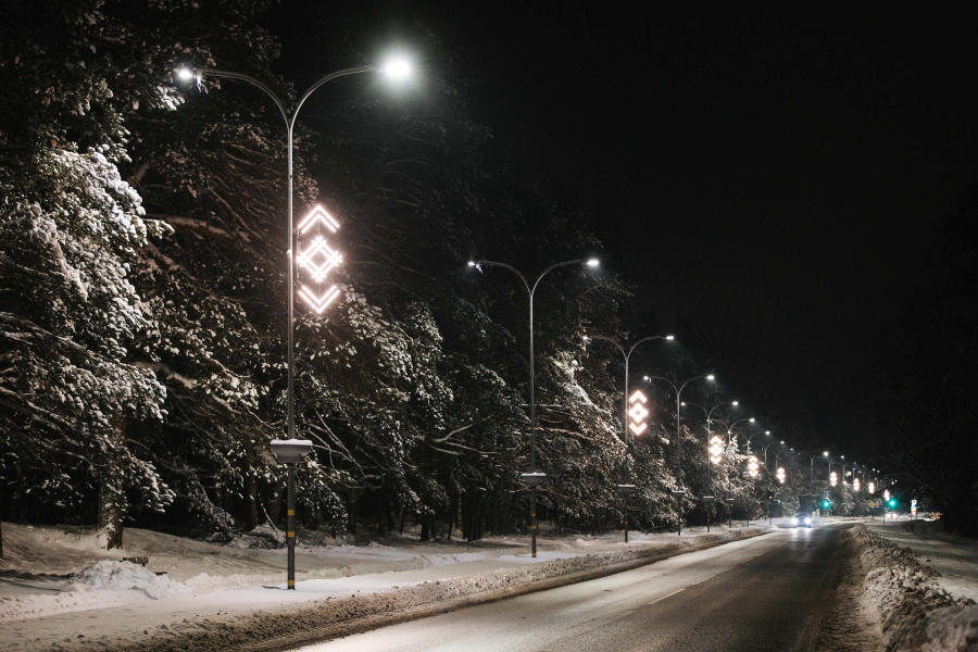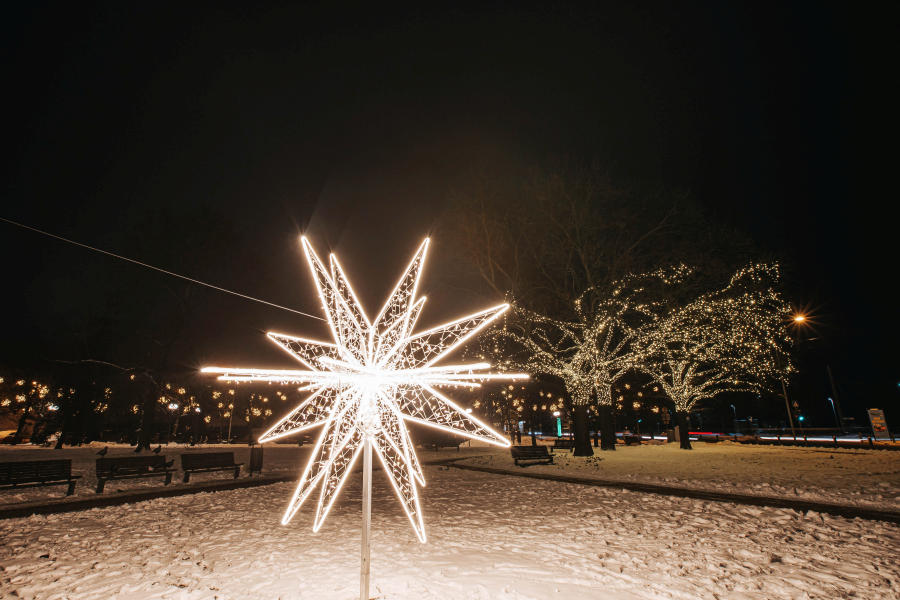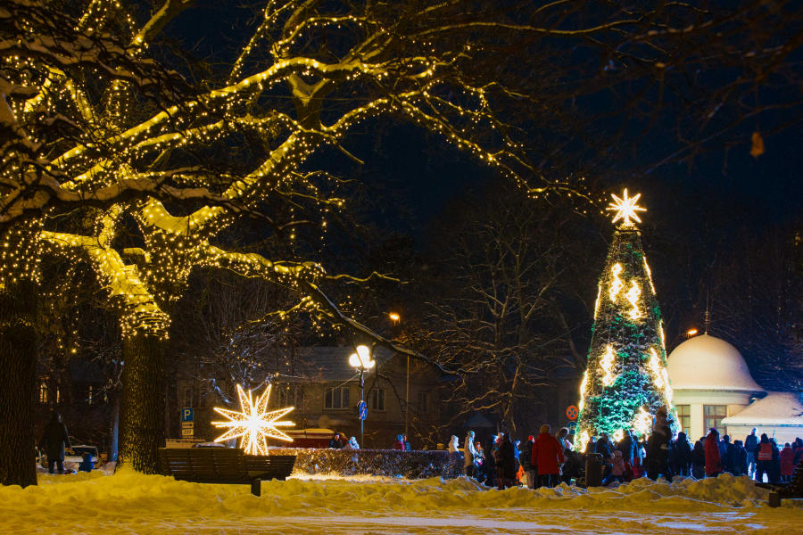 Gaismas ornamenti rotājas arī blakus esošā skvēra koku zaros, informē pašvaldība.