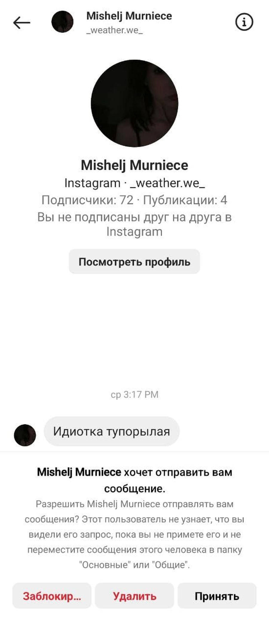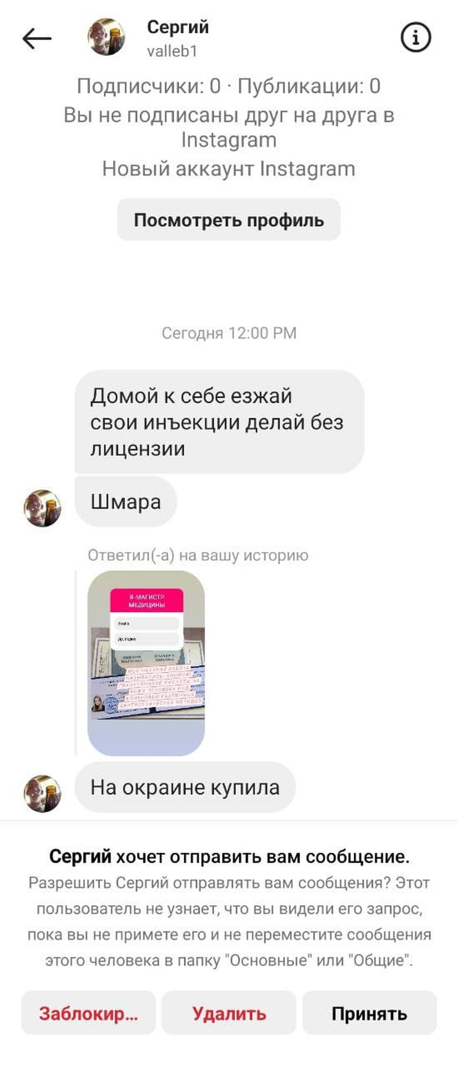 “Tu kad pie sevis uz mājām taisies uz “ragainiju”???? Vai arī tev palīdzēt aizbraukt????” Koriakinu privātā sarakstē uzrunā kāds anonīms “Instagram” lietotājs ar vārdu “@youngtimer_catalouge”. Cits ar vārdu “@valleb1” zina, kur Olga guvusi savu izglītību: “Mājās pie sevis brauc savas injekcijas bez licences taisīt. Šmara. Pamalē nopirkusi.” Jāpiebilst, ka par “okrainu” jeb “pamali” tā saucamajā “z-patriotu” vidē tiek dēvēta Ukrainas valsts. Kāda “@_weather.we_” ir lakoniskāka un raksta vienkārši: “Idiotene stulbpurnainā.” Savukārt kāda “ornella_smm” dalās pārdomās par to, kā bijis agrāk: “Njā, kamēr jūs no savas hoholijas nebijāt sabraukuši, pie mums ES tā nebija. Bija kārtība. Ceru, ka jūs iesēdinās par prettiesiskajām darbībām un to, ka kropļojat cilvēkus.”