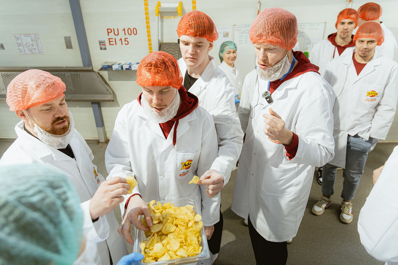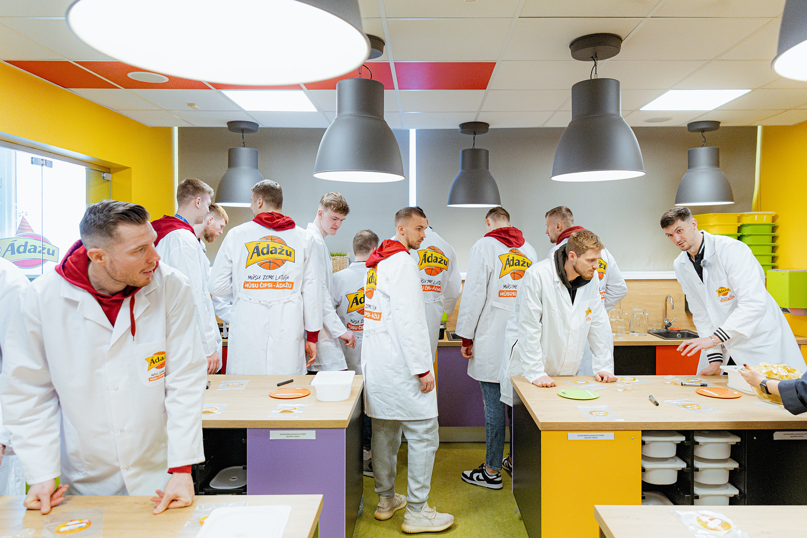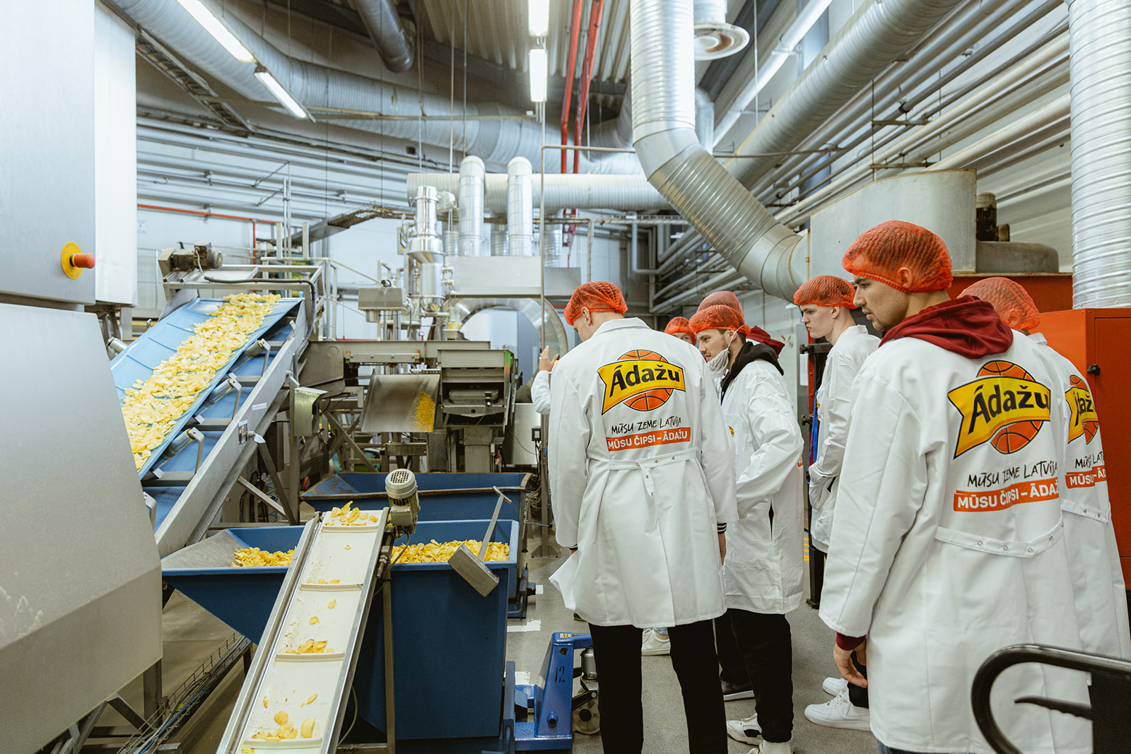 Ciemošanās laikā Latvijas izlases spēlētājiem bija iespēja tuvāk iepazīt “Ādažu” čipsu ražošanas gaitu – sākot no vietējo zemnieku audzētu kartupeļu rūpīgas atlases un sagatavošanas līdz čipsu iepakošanai. Komandas spēlētāji uzzināja, kā tiek nodrošināta produktu kvalitāte un kā dažādas iemīļotas garšas nonāk pie patērētājiem.