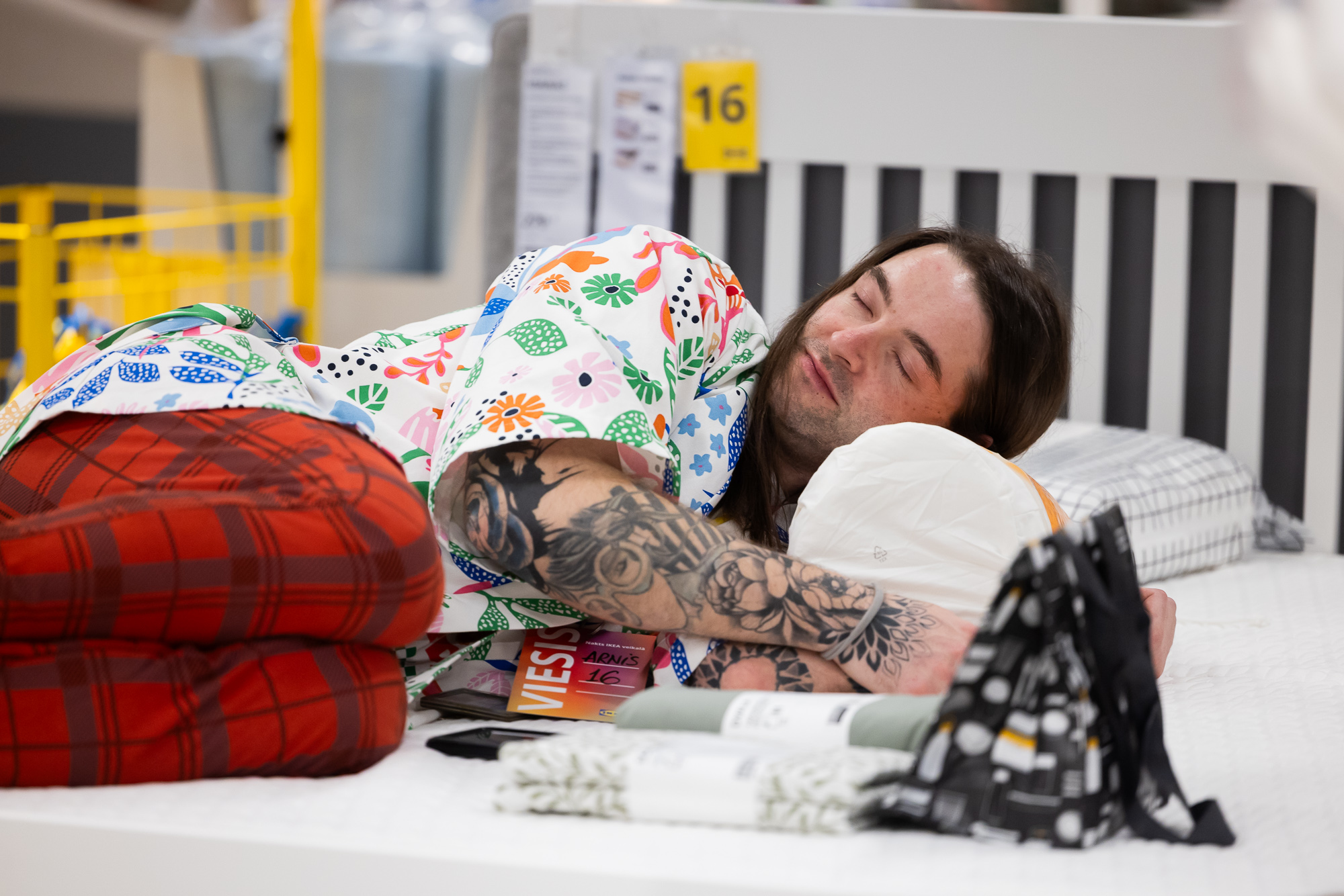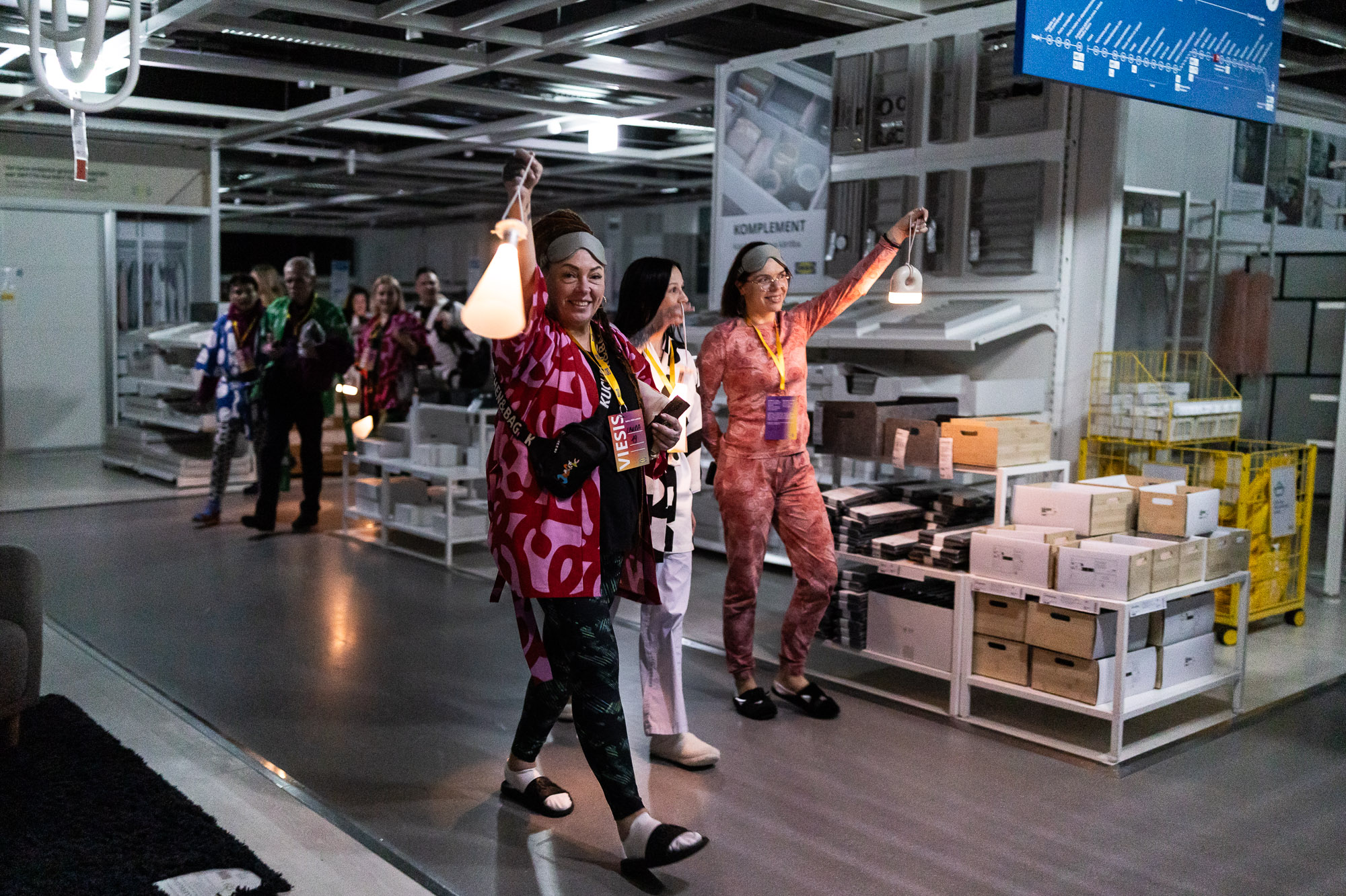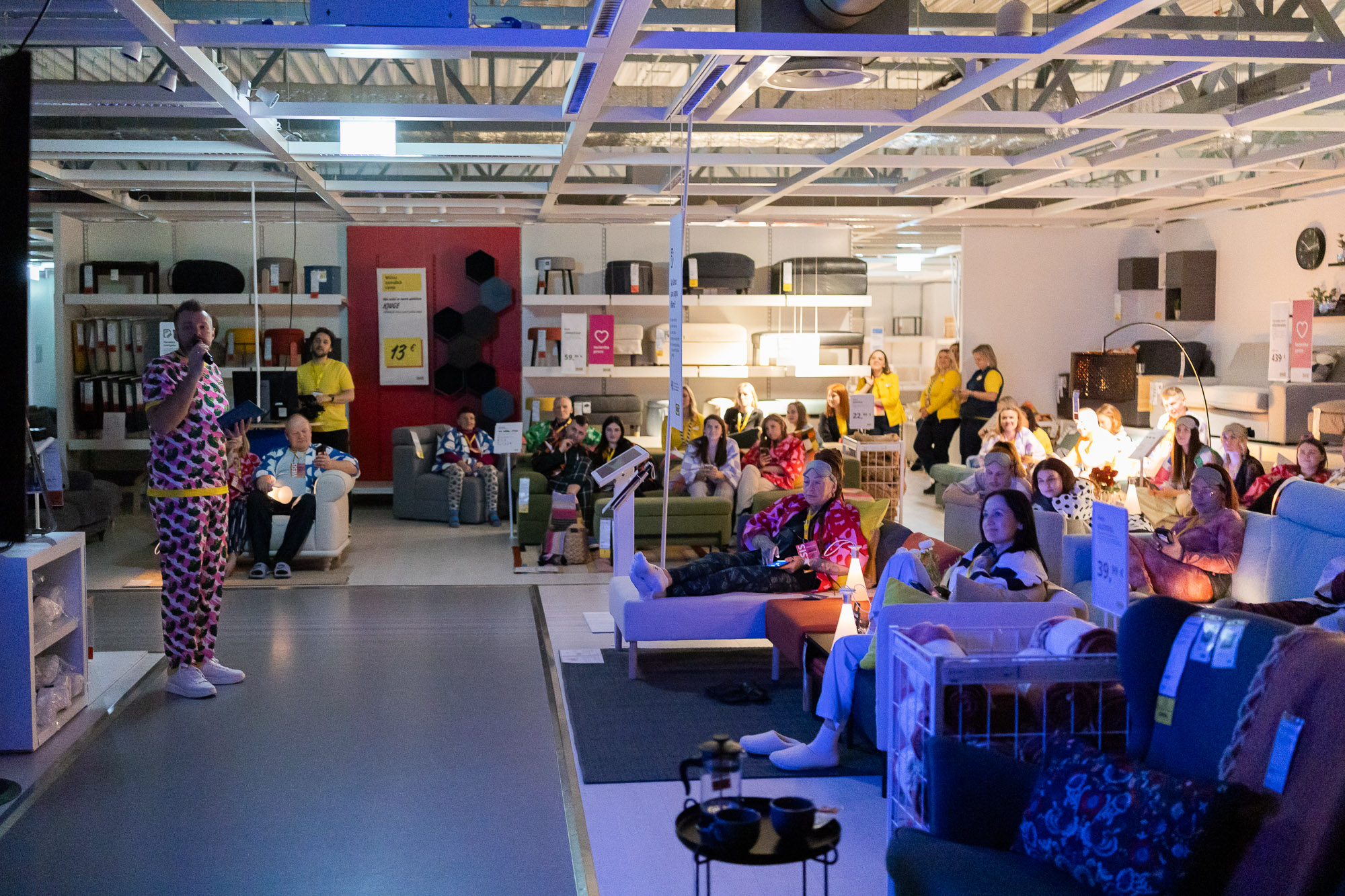 Trešdien, 2. aprīlī, 35 cilvēki nakšņoja IKEA veikalā Rīgā. Dalībnieku vidū bija Zviedrijas vēstniece Latvijā Kārina Hēglunda (Karin Höglund), pavārgrāmatu autore Zane Grēviņa, TV personība Kristīne Virsnīte, cilvēktiesību aktīvists un drag queen Rojs Rodžers, kā arī citi digitālā satura veidotāji un “IKEA Family” kluba dalībnieki.