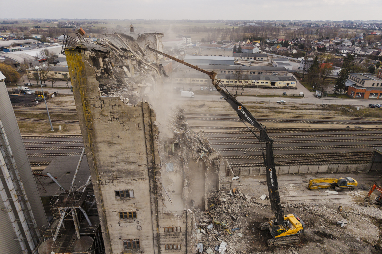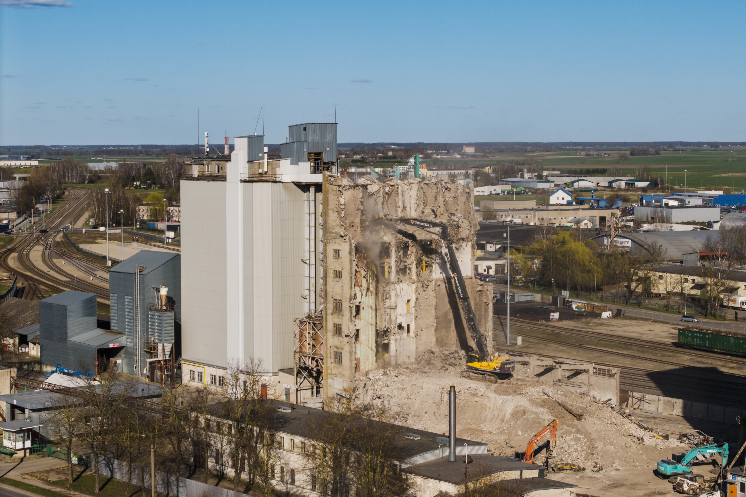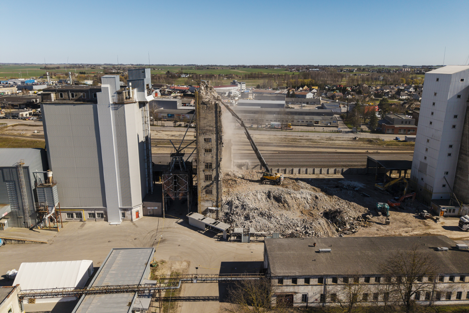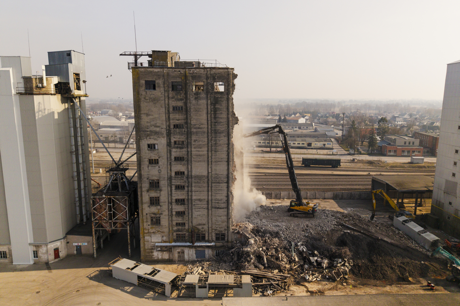Uzņēmums “Grāvējs” veicis īpaši sarežģītas padomju laika būves demontāžu Lietuvā, nojaucot labības elevatoru Marijampolē Vairāk nekā 60 gadus vecā būve bija daļa no ražošanas kompleksa.