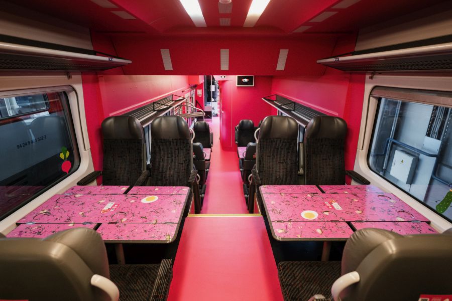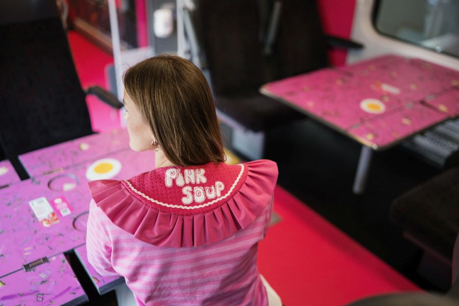 Rozā zupas vilciens piedāvā unikālu un vizuāli saistošu ceļošanas pieredzi: vienam no trim vilciena vagoniem ir tematisks dizains, ko iedvesmojis Lietuvas tradicionālais ēdiens – aukstā biešu zupa šaltibarščiai. Vagona interjers un dizaina elementi izstrādāti, lai radītu spilgtu, vasarīgu noskaņu un piedāvātu pasažieriem iespēju izbaudīt ceļojumu, kas ir ne tikai ērts, bet arī vizuāli iedvesmojošs. Pārējie divi vagoni saglabās ierasto izskatu, un pasažieri paši varēs izvēlēties, vai ceļot tematiskajā rozā vagonā, vai kādā no parastajiem. Pērkot biļeti LTG Link mājaslapā vai mobilajā lietotnē, rozā reiss būs viegli atpazīstams – tas būs atzīmēts ar īpašu marķējumu Pink soup train.