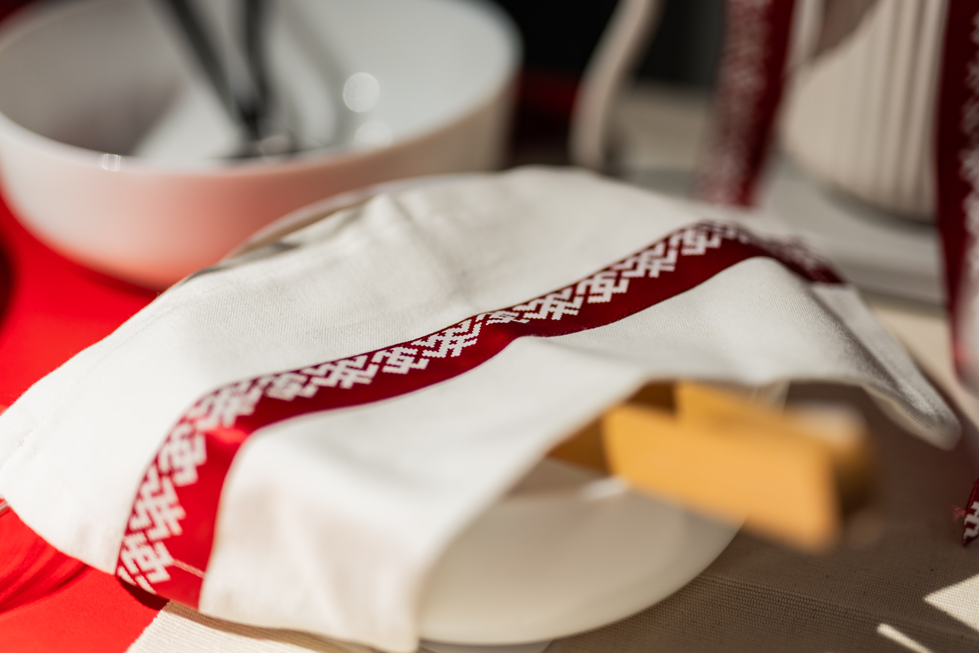 Sarkanbaltsarkans galda klājums – latviski un etnogrāfiski